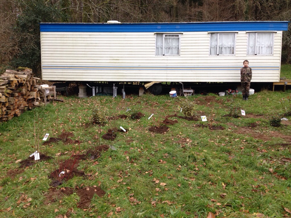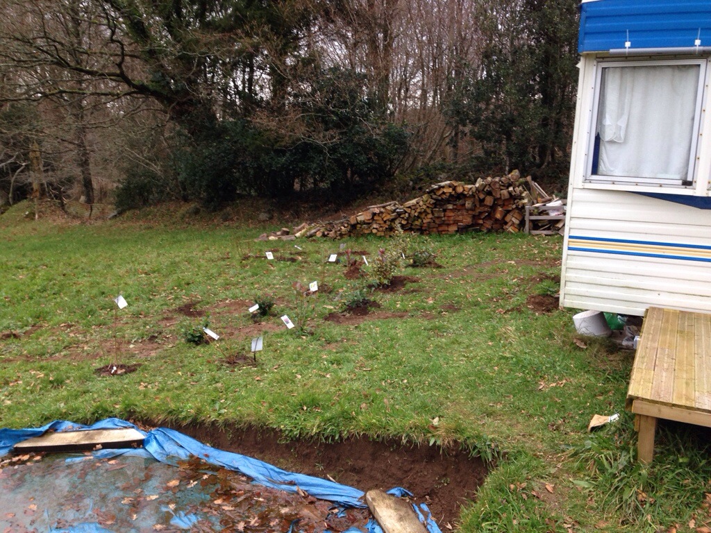 Hier, le thème était la plantation d’une haie d’arbustes devant le mobil-home, histoire de le rendre un peu moins visible dans ce beau paysage de nature.
