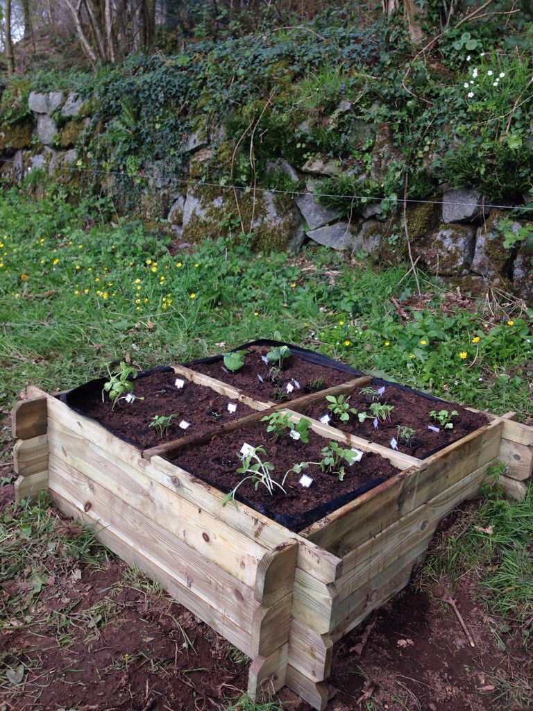 En entrée, installation du carré de jardinage, avec plantage des semis que Léo avait fait poussé à PUTEAUX.