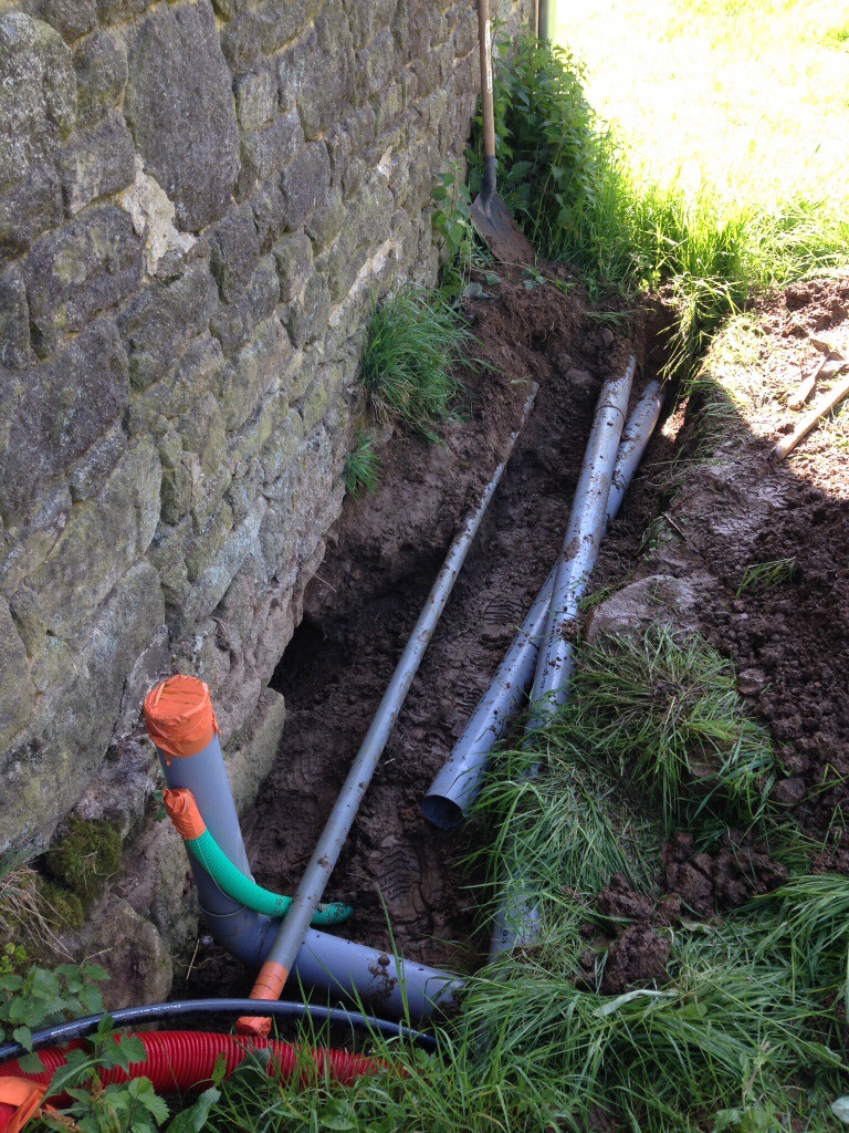 J’ai dû réouvrir les tranchées extérieures, afin d’optimiser la pente globale du tuyau, et notamment à l’endroit de son passage sous le mur, récemment percé.