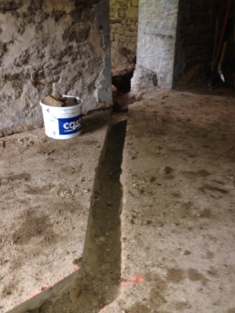 Puis nous nous sommes attaqués aux tranchées à l’intérieur… Tom a bien usé du burineur pour casser l’ancienne dalle de béton… Il nous a fallu 4h pour arriver à un résultat satisfaisant: