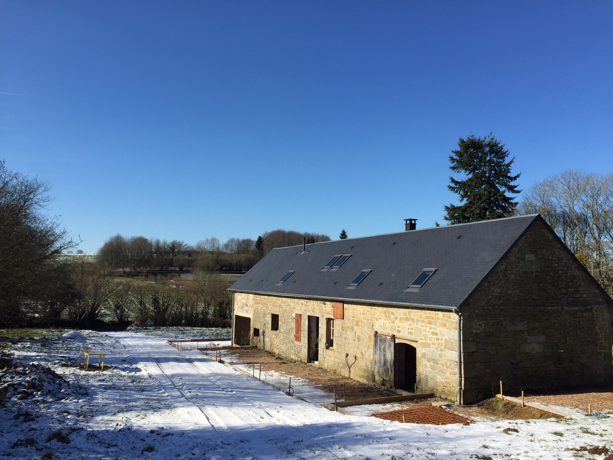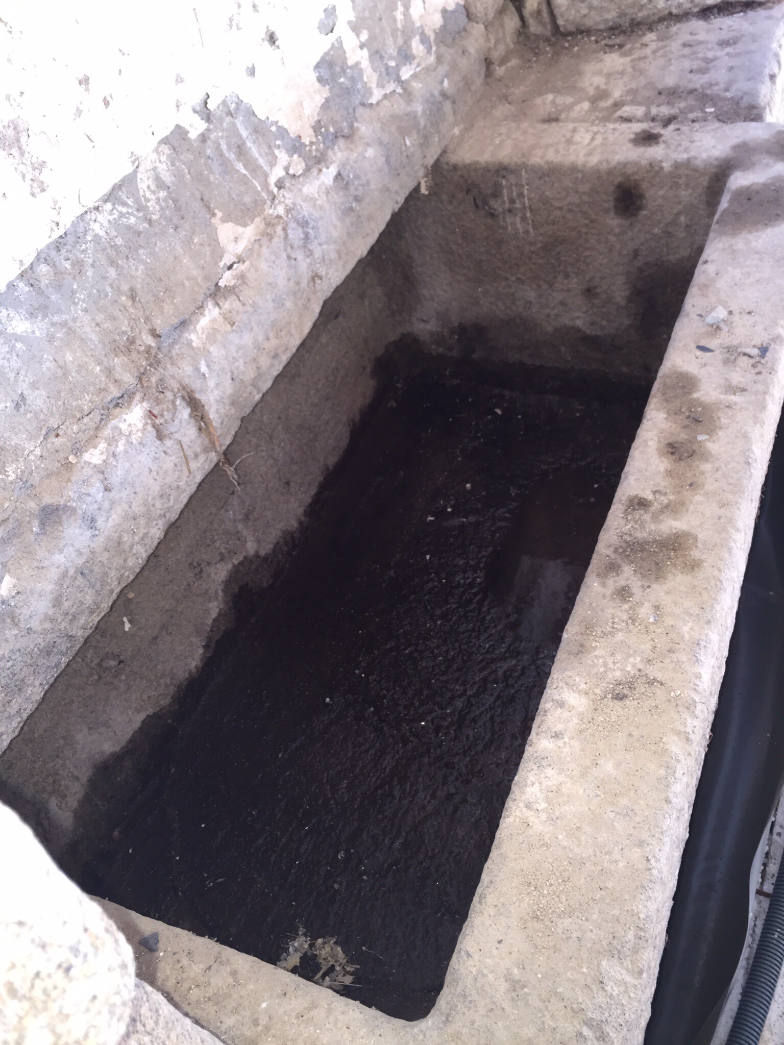 Nous avons aussi retiré les vielles ardoises qui remplissaient encore un super bac taillé dans un gros bloc de granit, scellé dans un mur intérieur de la maison.