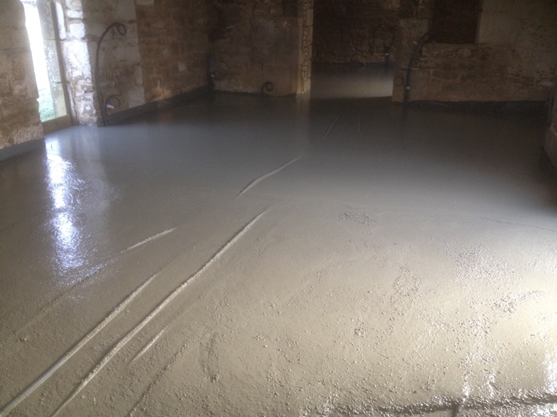 Le béton vient d’être fraîchement coulé, sur les dalles intérieures et extérieures.