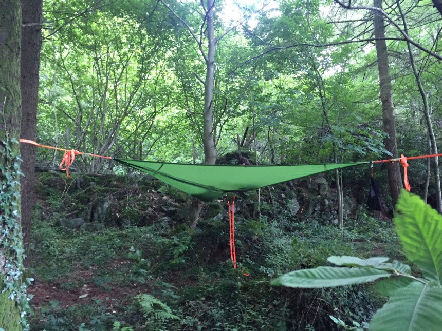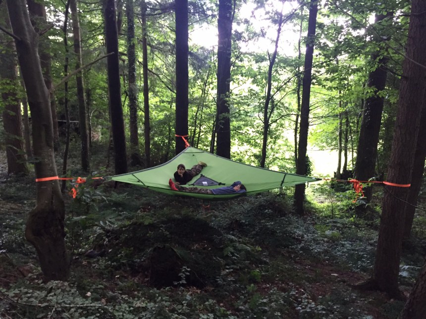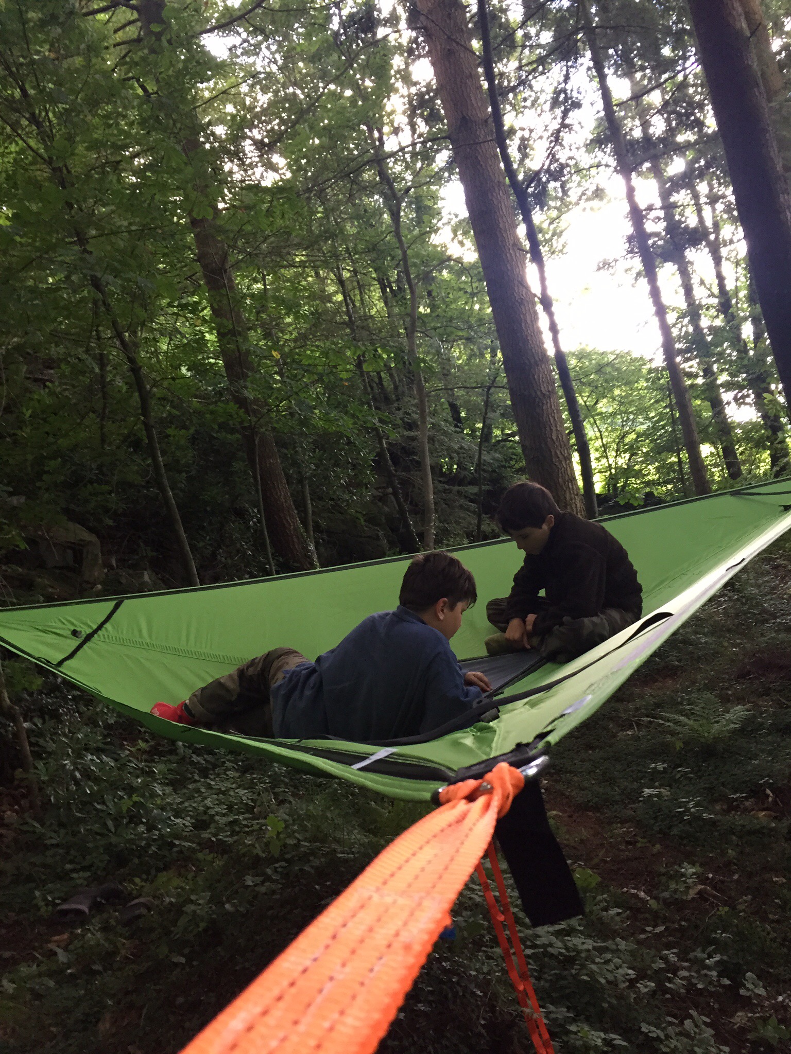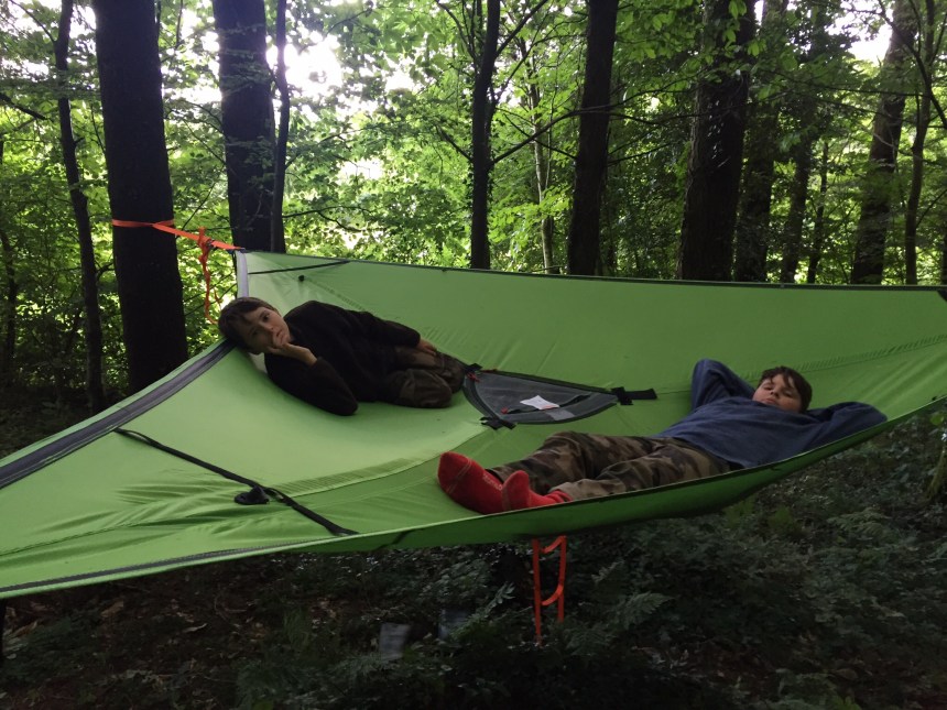 En début de journée nous avons installé et testé la tente à suspendre dans les arbres. Après avoir choisi 3 gros arbres bien positionnés, nous avons tendu les sangles, et laissé les gars inaugurer ce nouvel espace de repos à l’ombre.