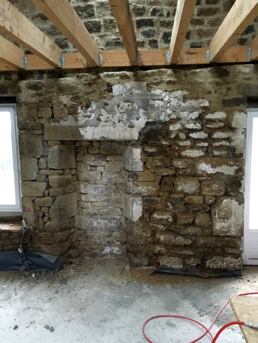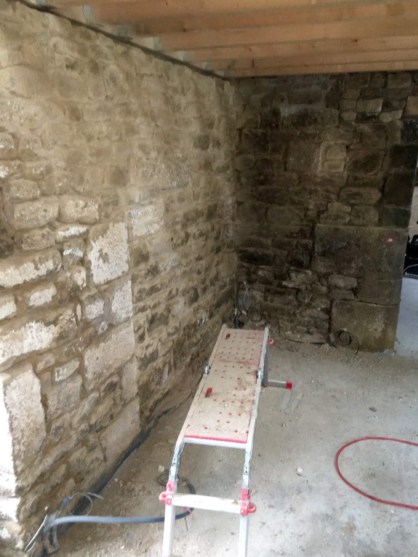 Niveaux travaux, un second burin pneumatique va nous permettre de s’attaquer aux murs à deux de front. Le compresseur ne chôme pas, et nous mangeons de la poussiére. Nettoyer tous les murs de la pièce principale va être un chantier long et poussiéreux!