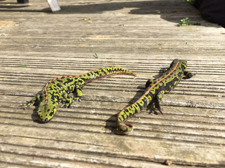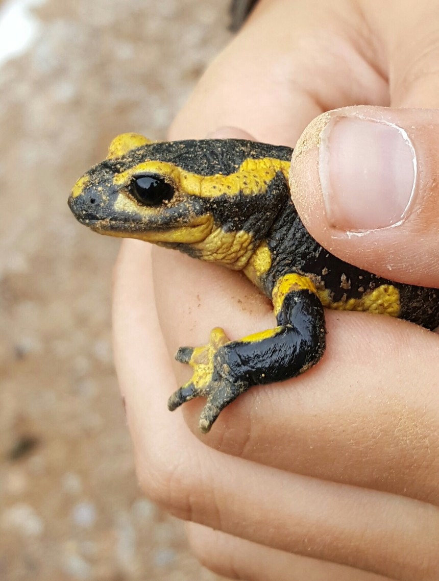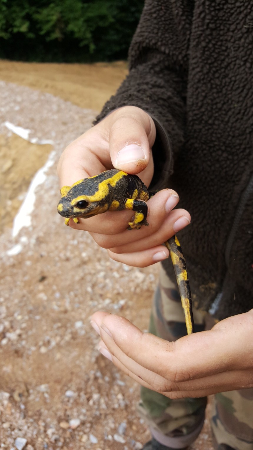- La pluie est-elle tombée si fort la semaine dernière que la marre déborde déjà?… Finalement non, quelques traces d’humidité tout au plus… Mais on a réussi à sauver une Salamandre qui semblait avoir du mal à ressortir du trou.
