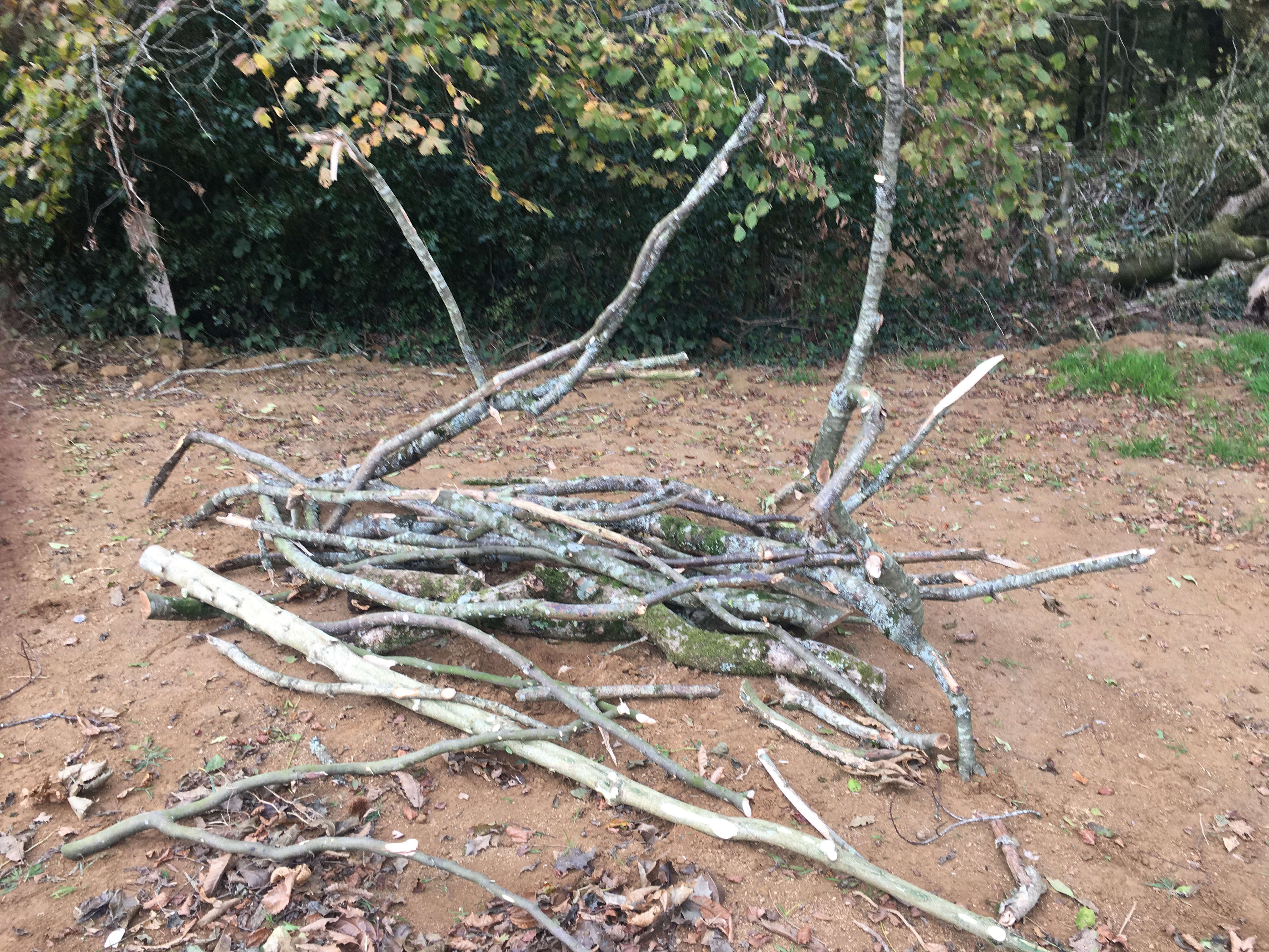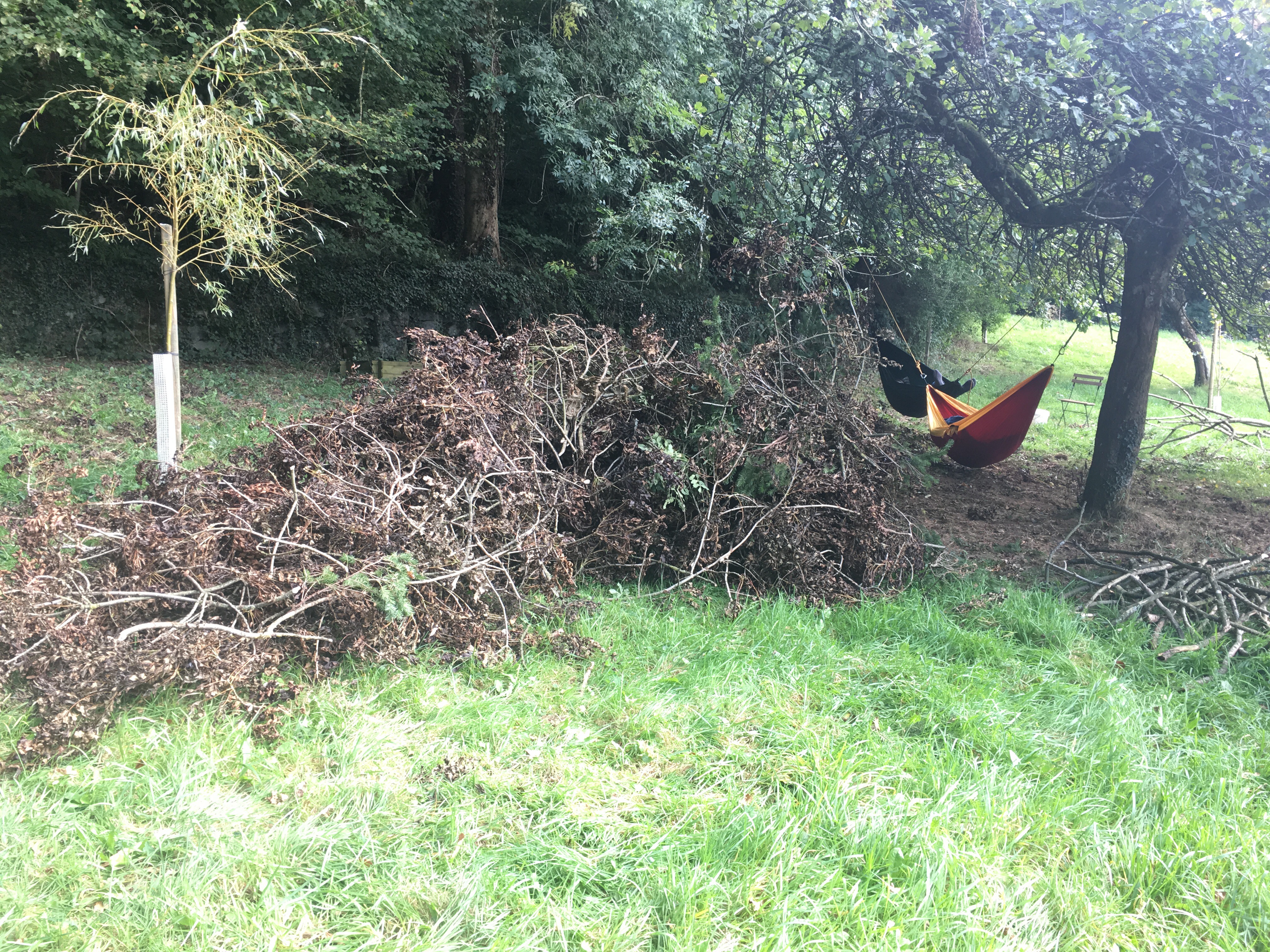 Le troisième jour aura été un peu plus bruyant et sûrement plus fatiguant, puisqu’il s’agissait de débiter les branches à la tronçonneuse. Les coins pour ranger le bois à l’abris ne manquent pas, notre réserve de bois pour le feu (ou le futur poil à bois) vient d’augmenter!