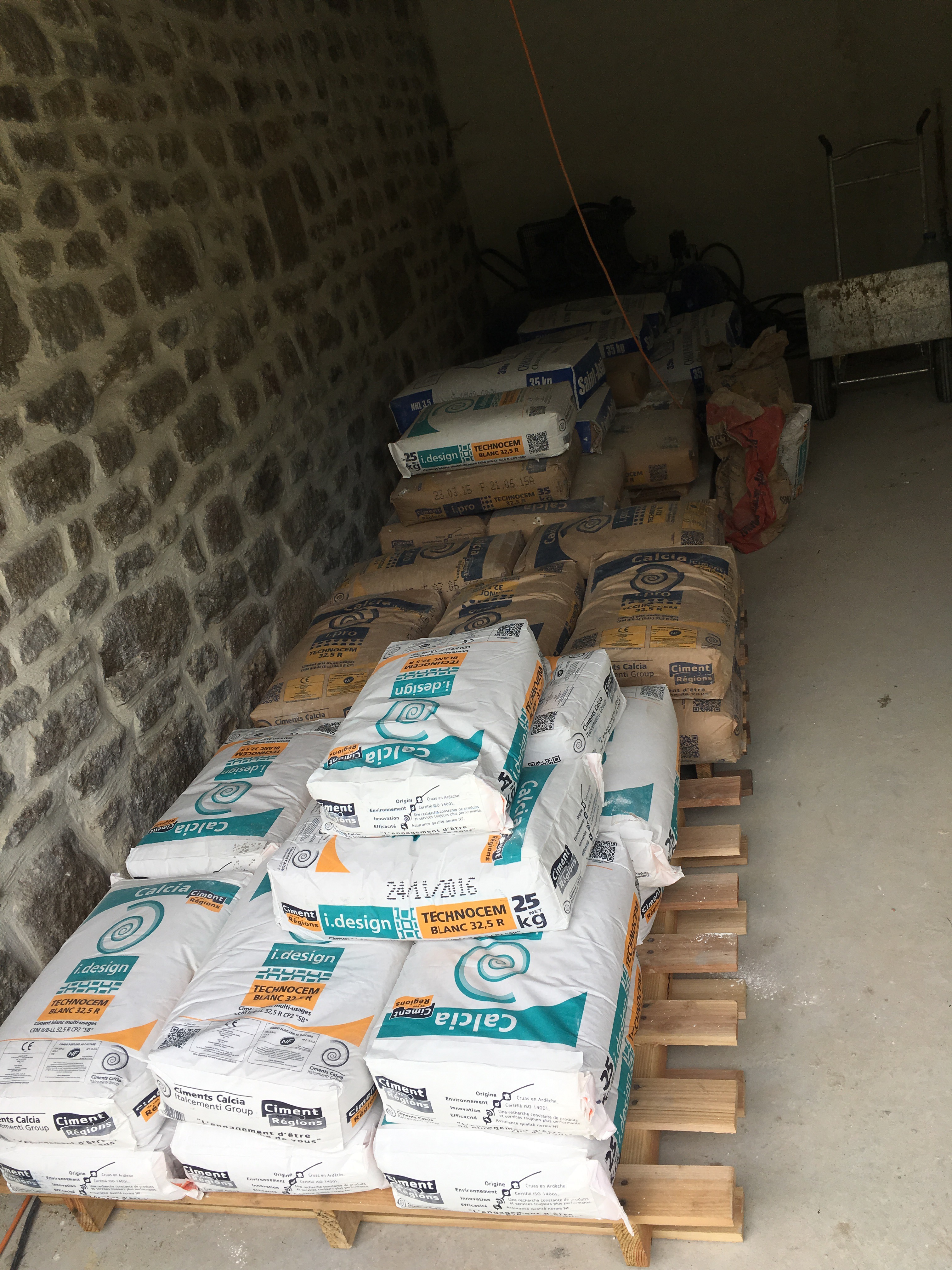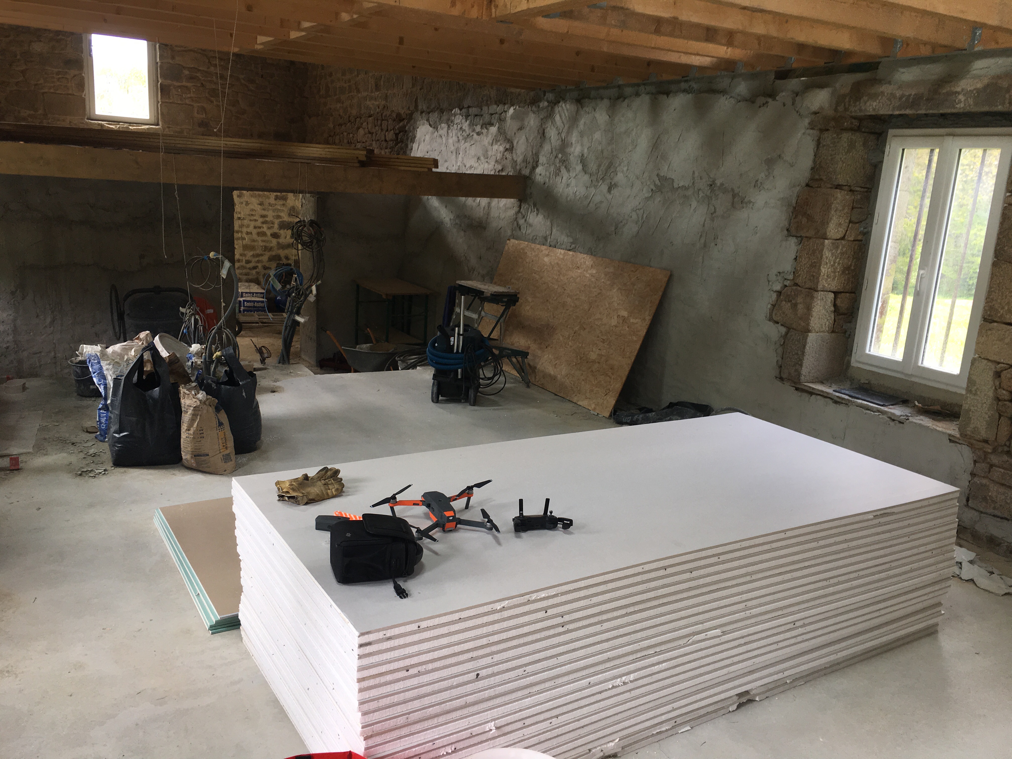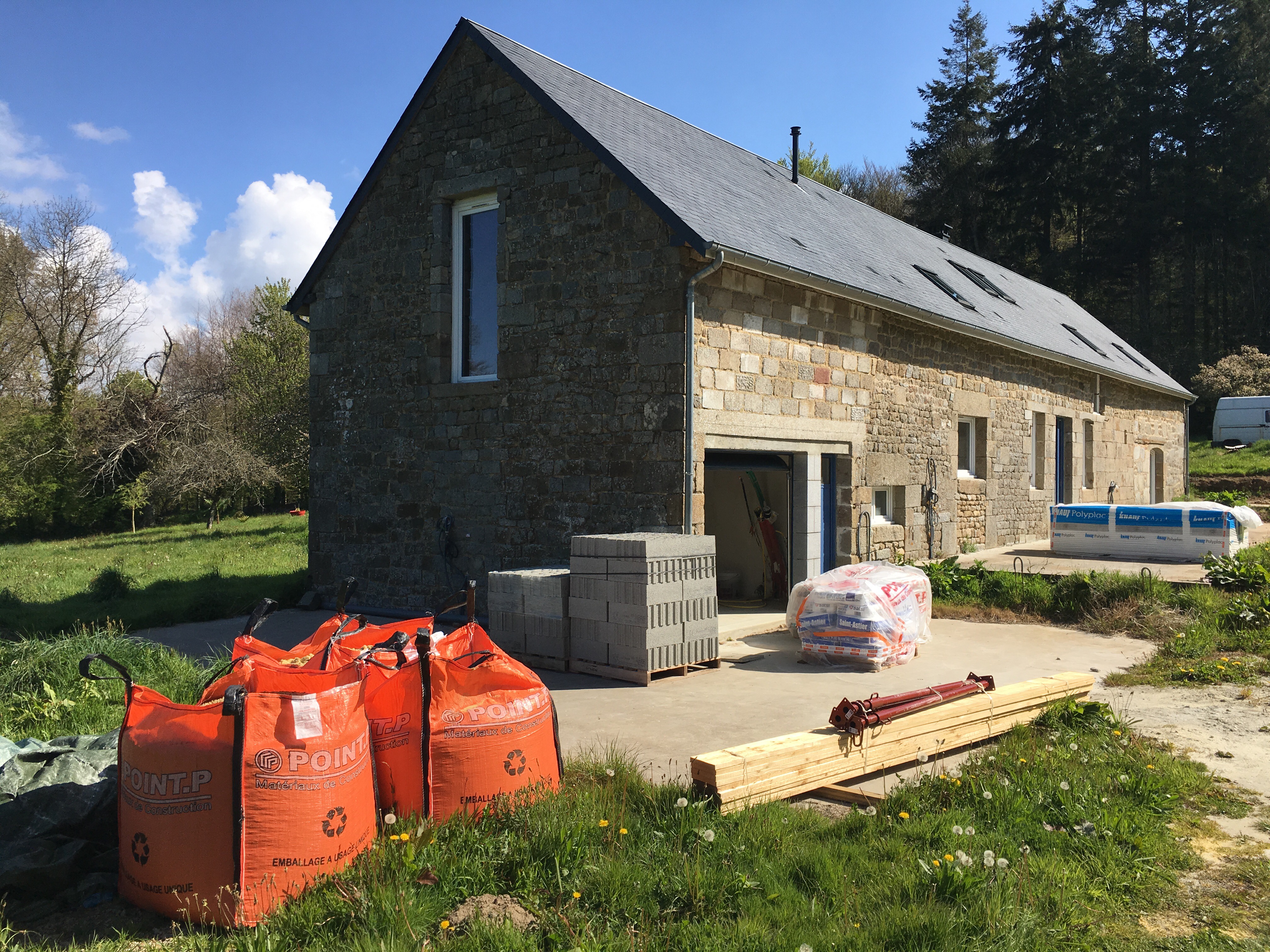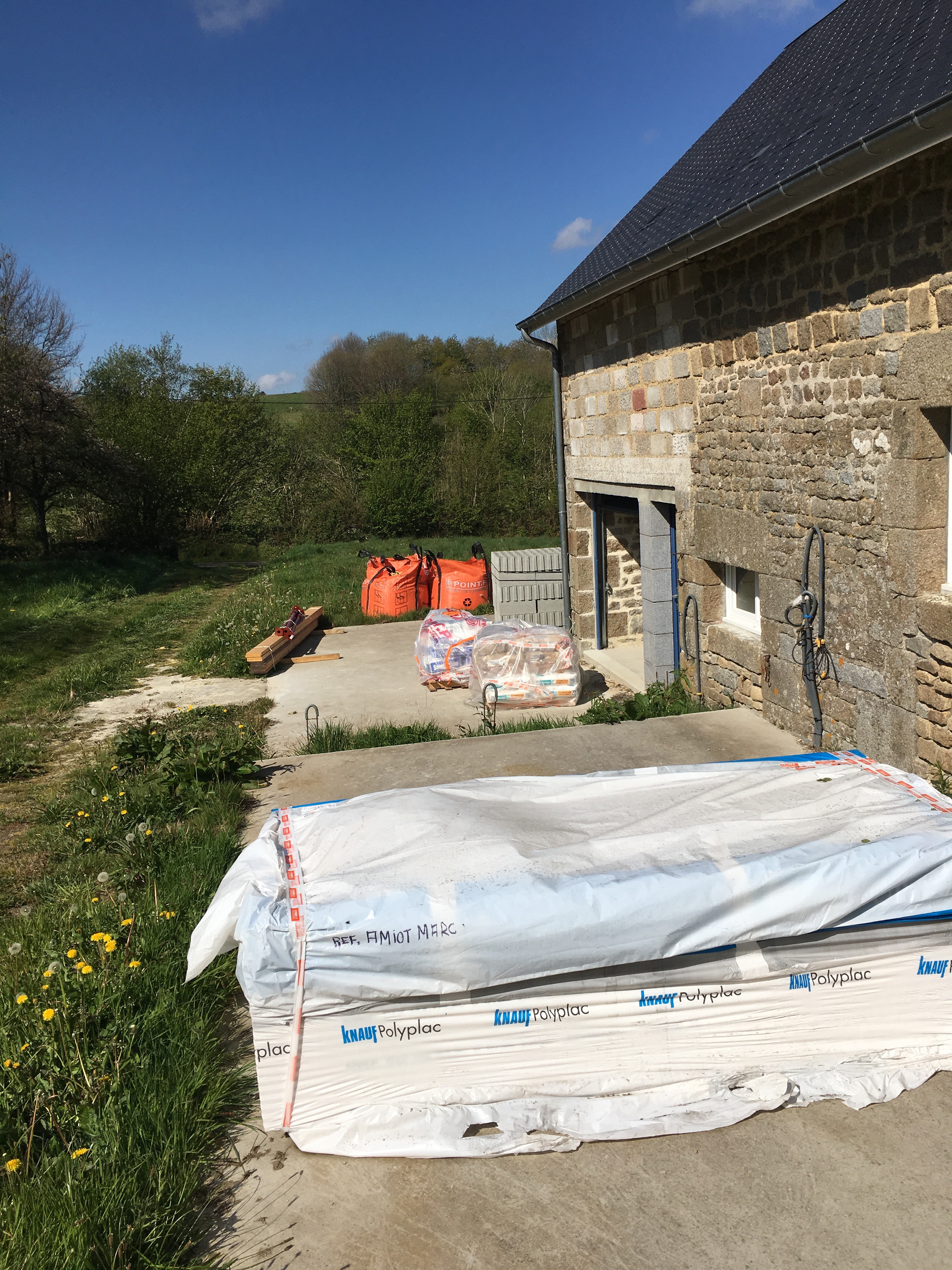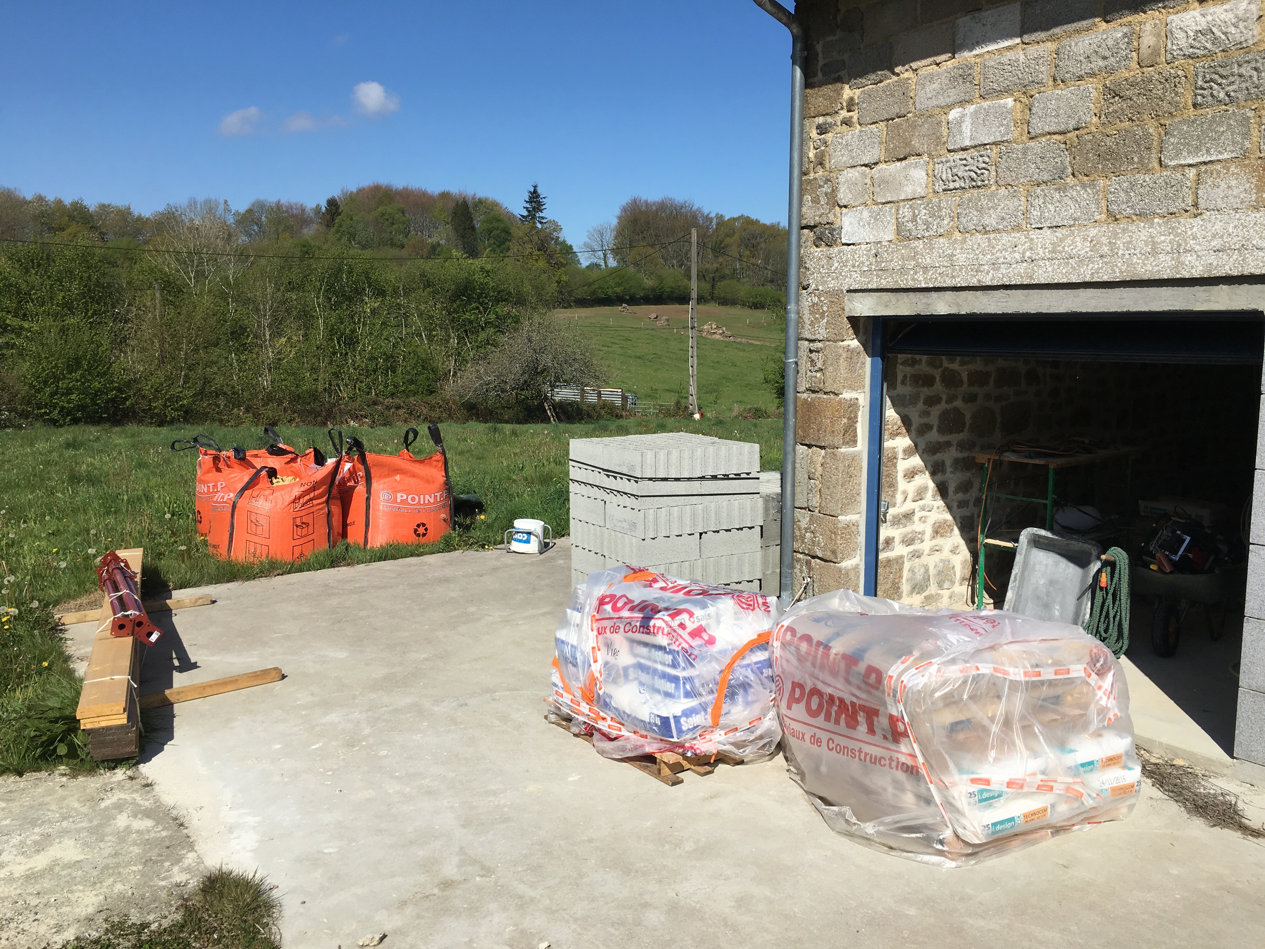 Ce samedi, Point P avait livré les materiaux de construction commandés il y a 2 semaines: plaques de placo, sacs de ciment de chaux, big bag de sable et gravier, parpaings, etc… de quoi nous occuper pendant quelques mois.
