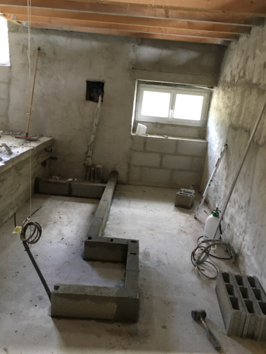 Il était temps de se lancer dans le montage du mur en parpaing, le premier rang est le plus critique… j’ai pris mon temps mais ça a value le coup… espérons que les autres rangs seront plus rapides à monter!