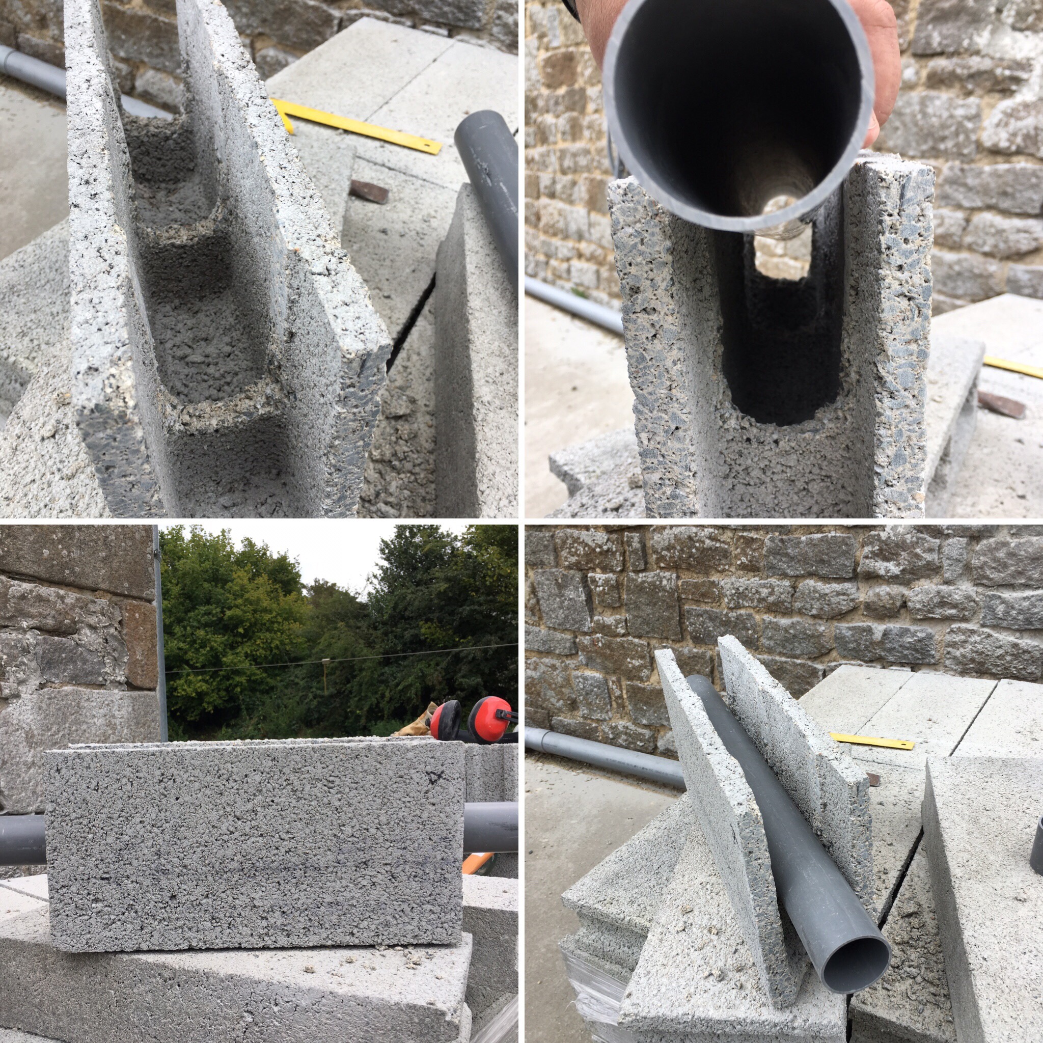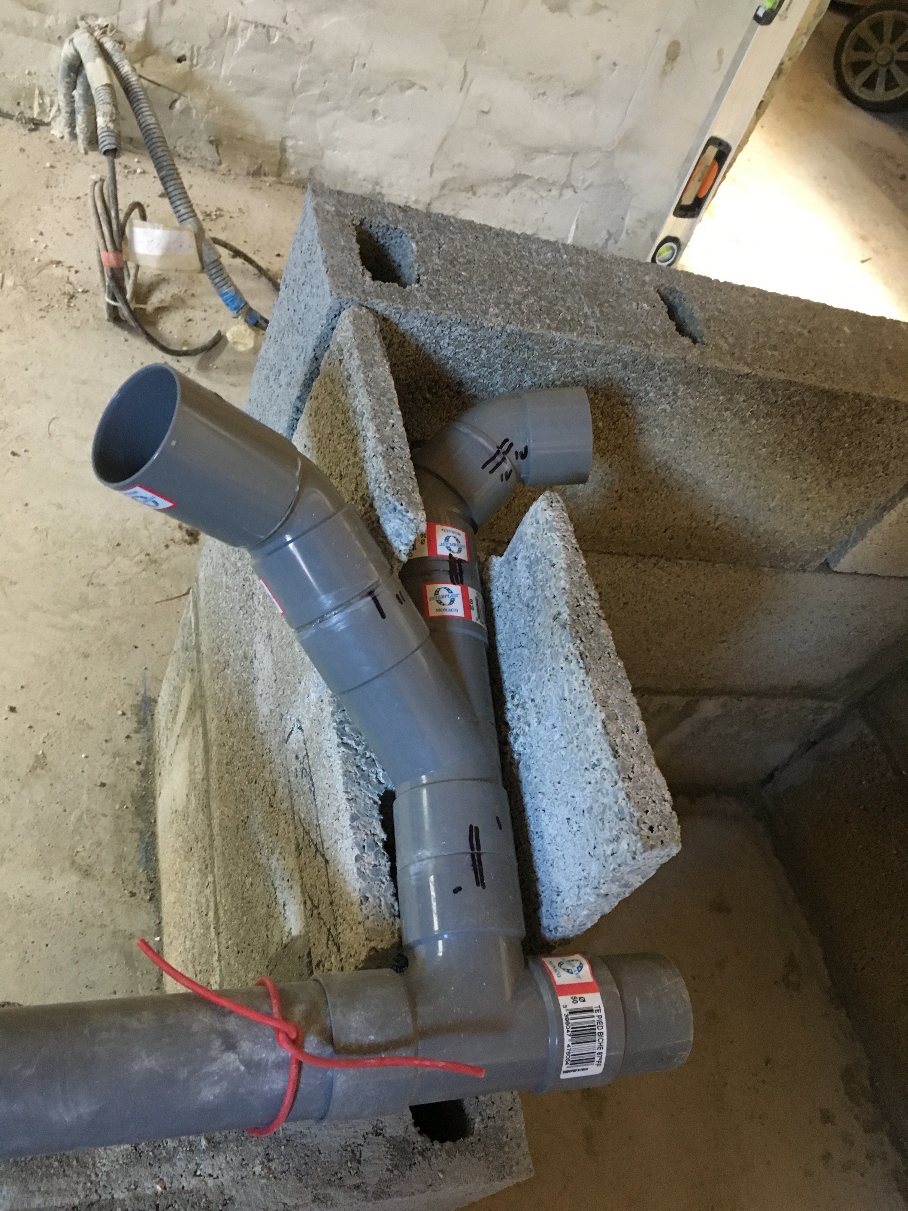 Malgré toutes les pieces PVC que j’ai en stock, une m’a manquée pour coller toute la canalisation. Comble de malchance, un 15 Aout, tous les magasins de bricolage dans la région sont fermés, je me suis donc résolu à préparer la découpe de tous les parpaings du rang… et c’est un travail de découpe au lapidaire et de taille au marteau que j’avais un peu sous-estimé, cela m’a donc pris toute l’après-midi.