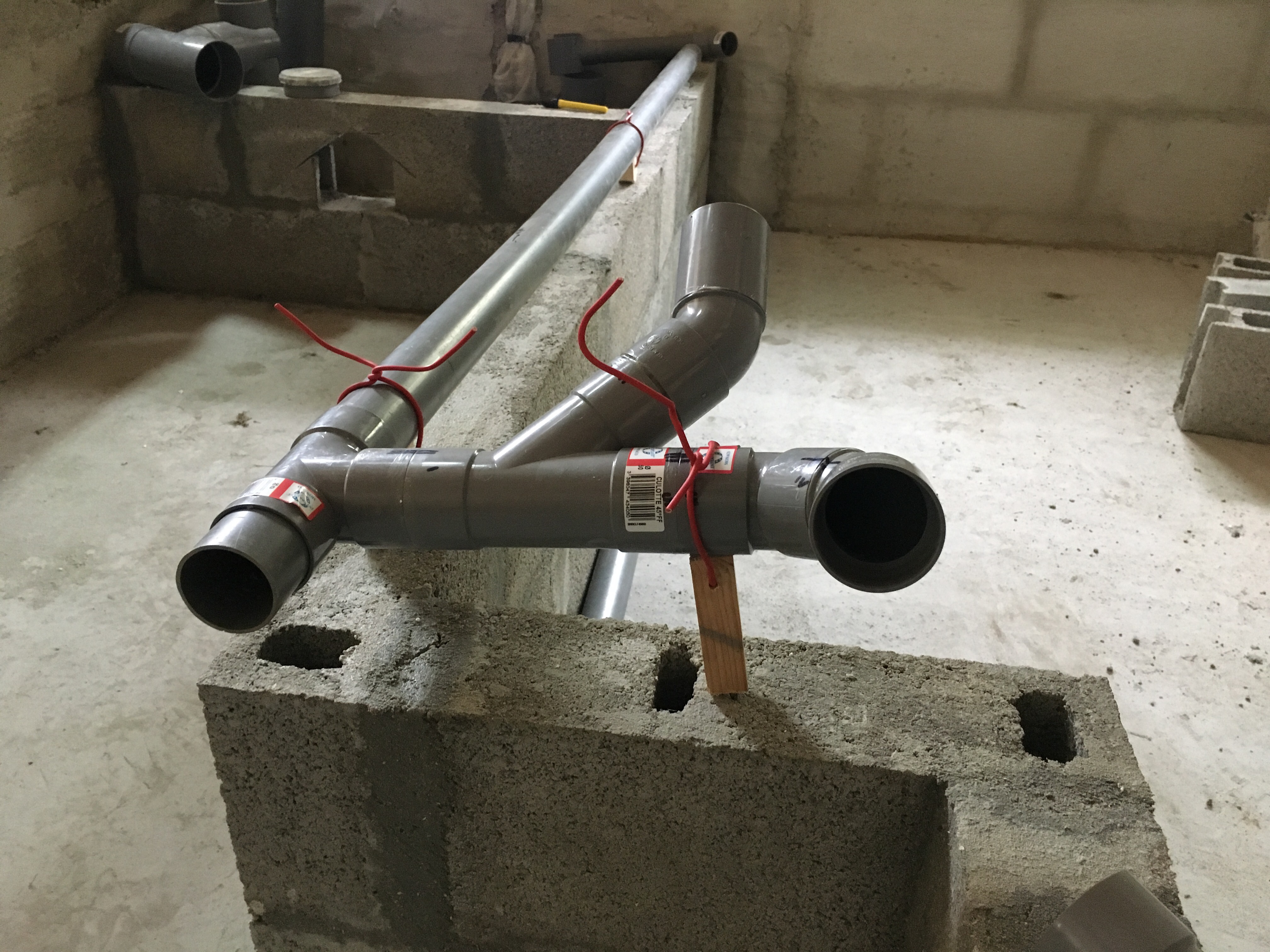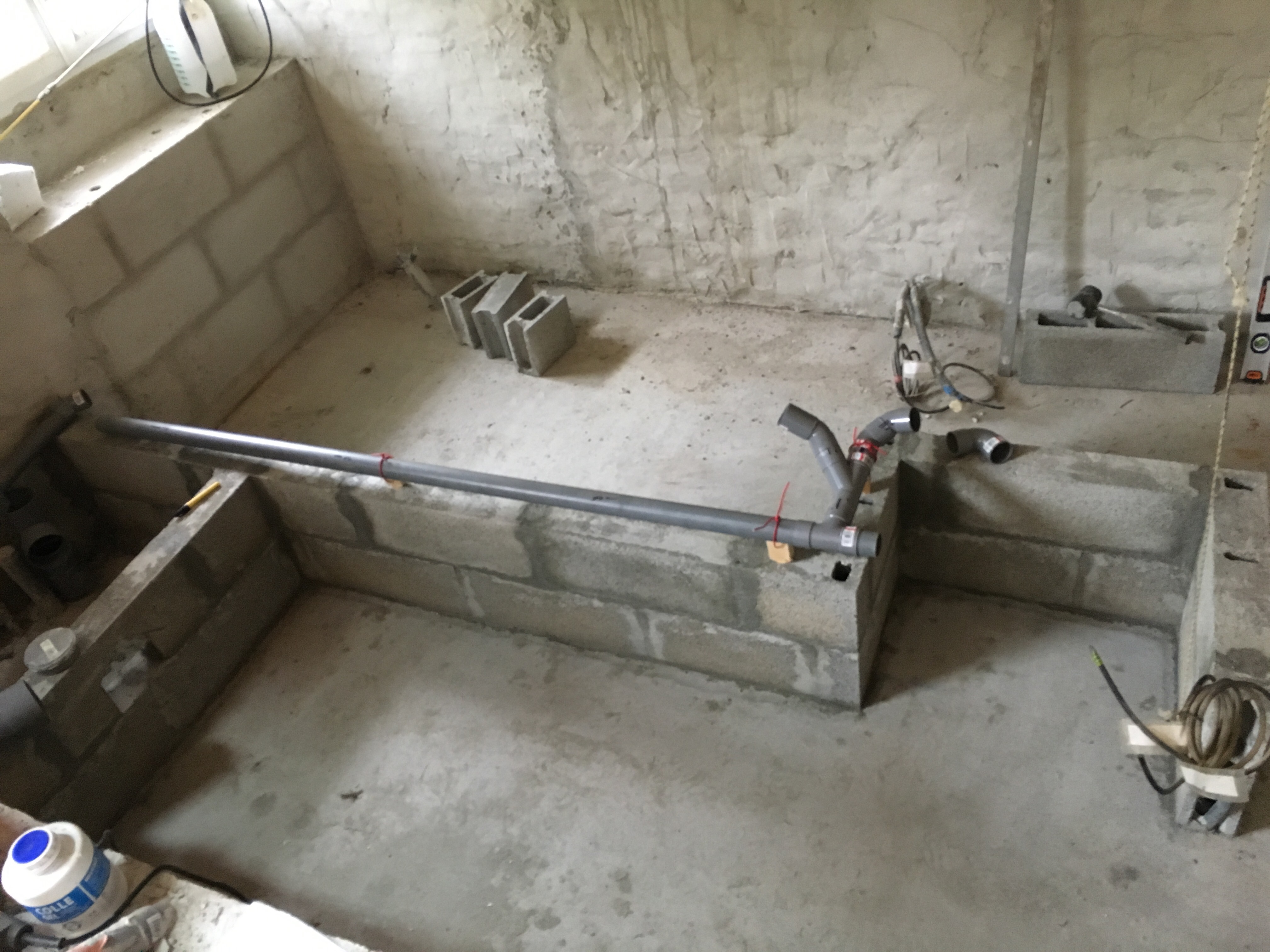 Une journée en solo pour avancer le mur avec pour objectif de monter le rang de parpaing qui doit cacher les tuyaux PVC d’évacuation des lavabos.