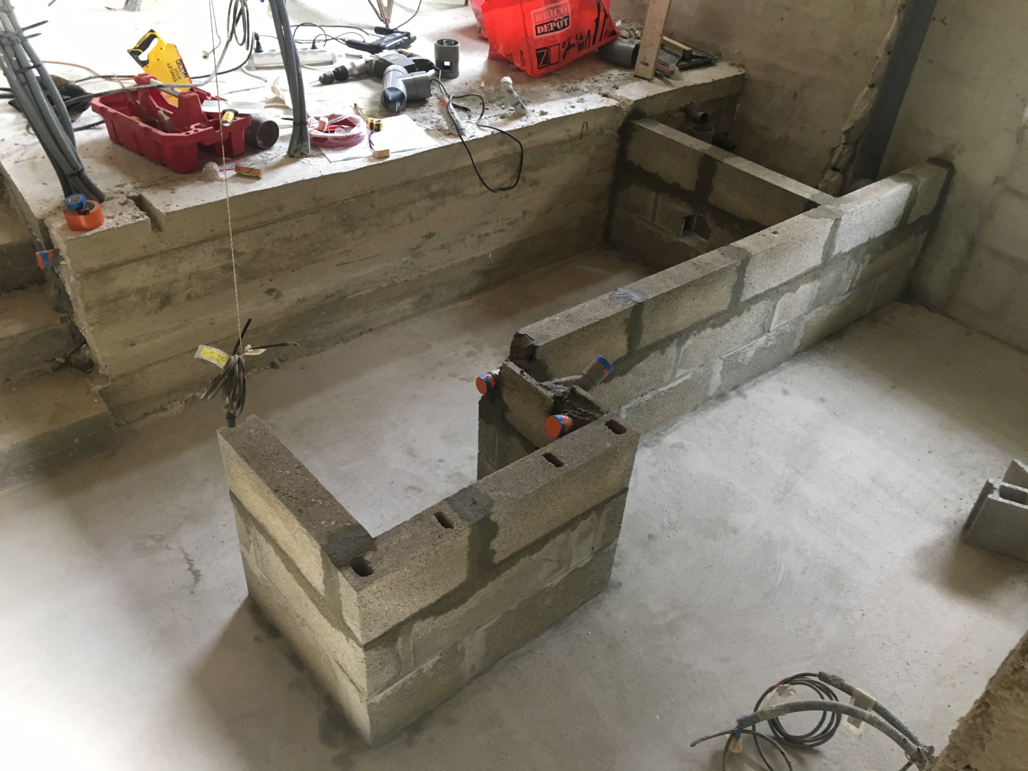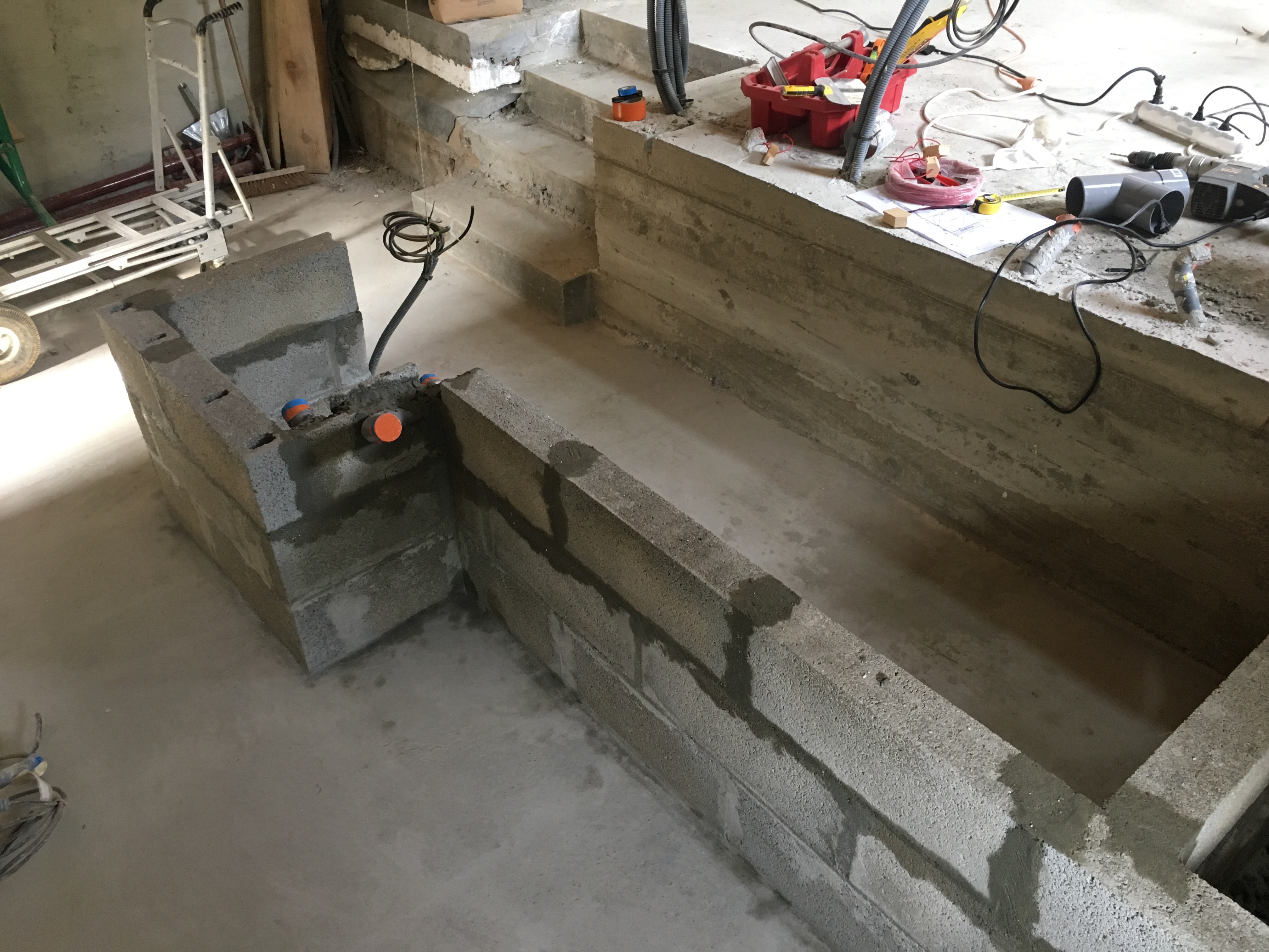 Coté maçonnerie, la canalisation en PVC a été collée et mise en place. Les parpaings « sculptés » ont ensuit été scellés… tout roule!