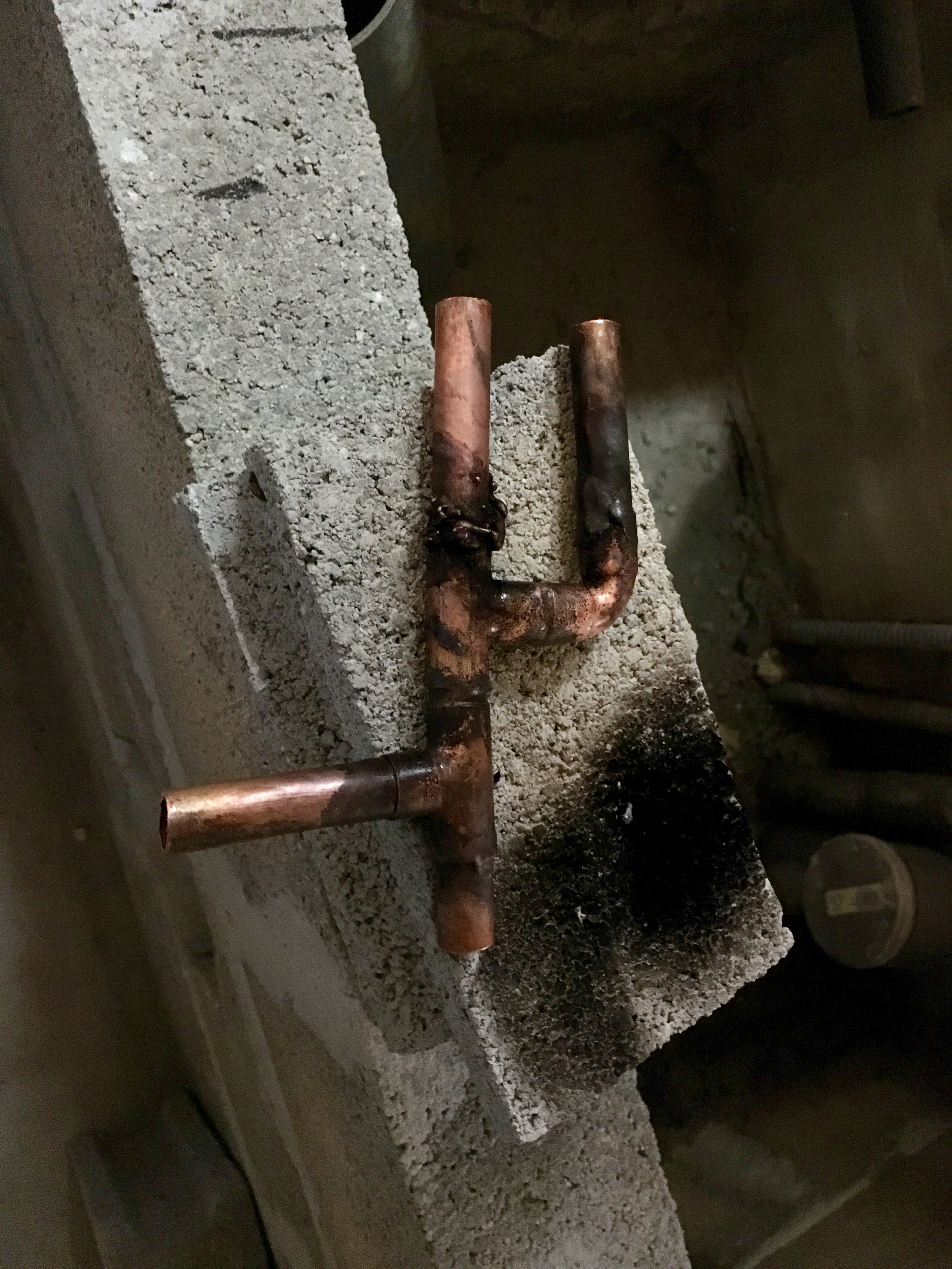 Il reste encore beaucoup de travail sur les canalisations Cuivre, et je m’attaque à la distribution de l’eau vers les vasques du rez-de-chaussée, avec notamment les tuyaux qui passent dans le nouveau mur.