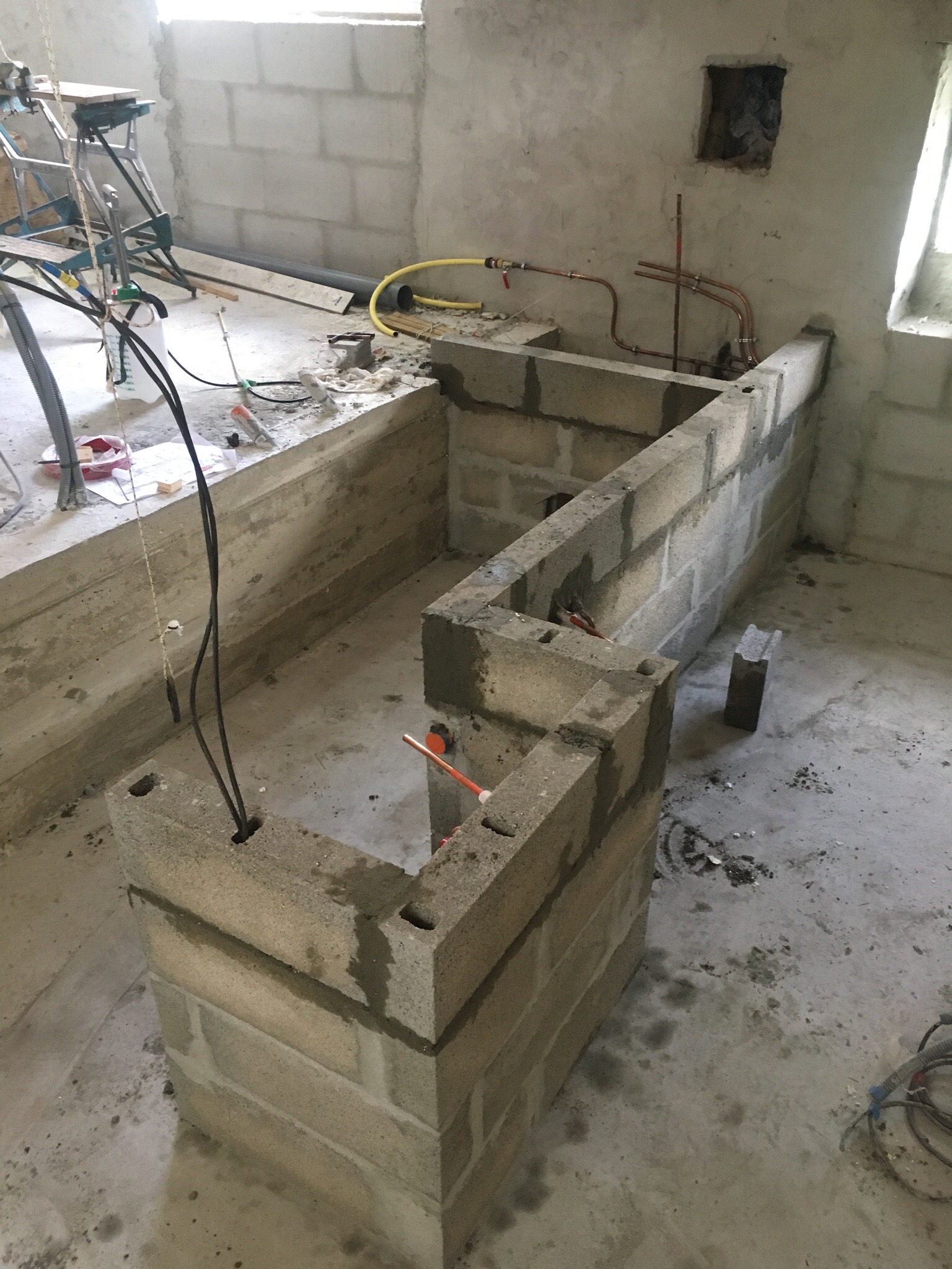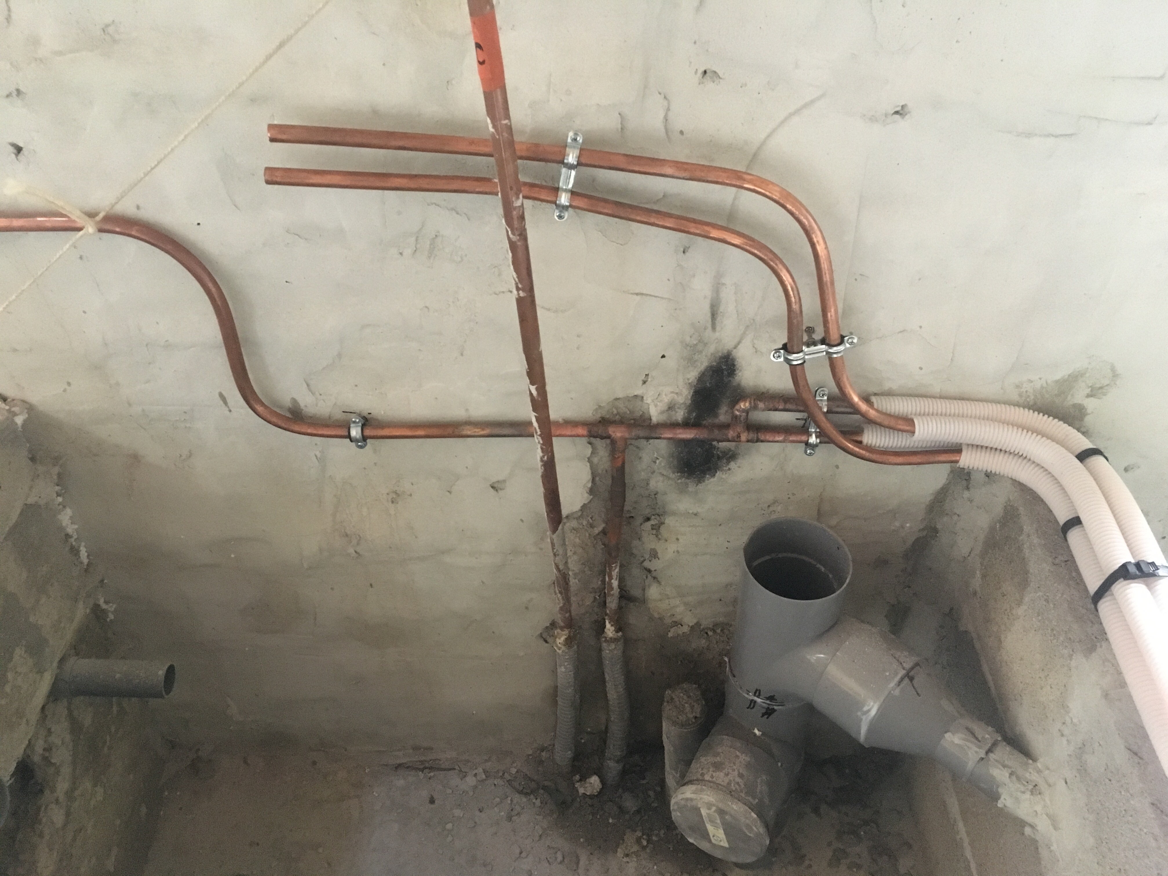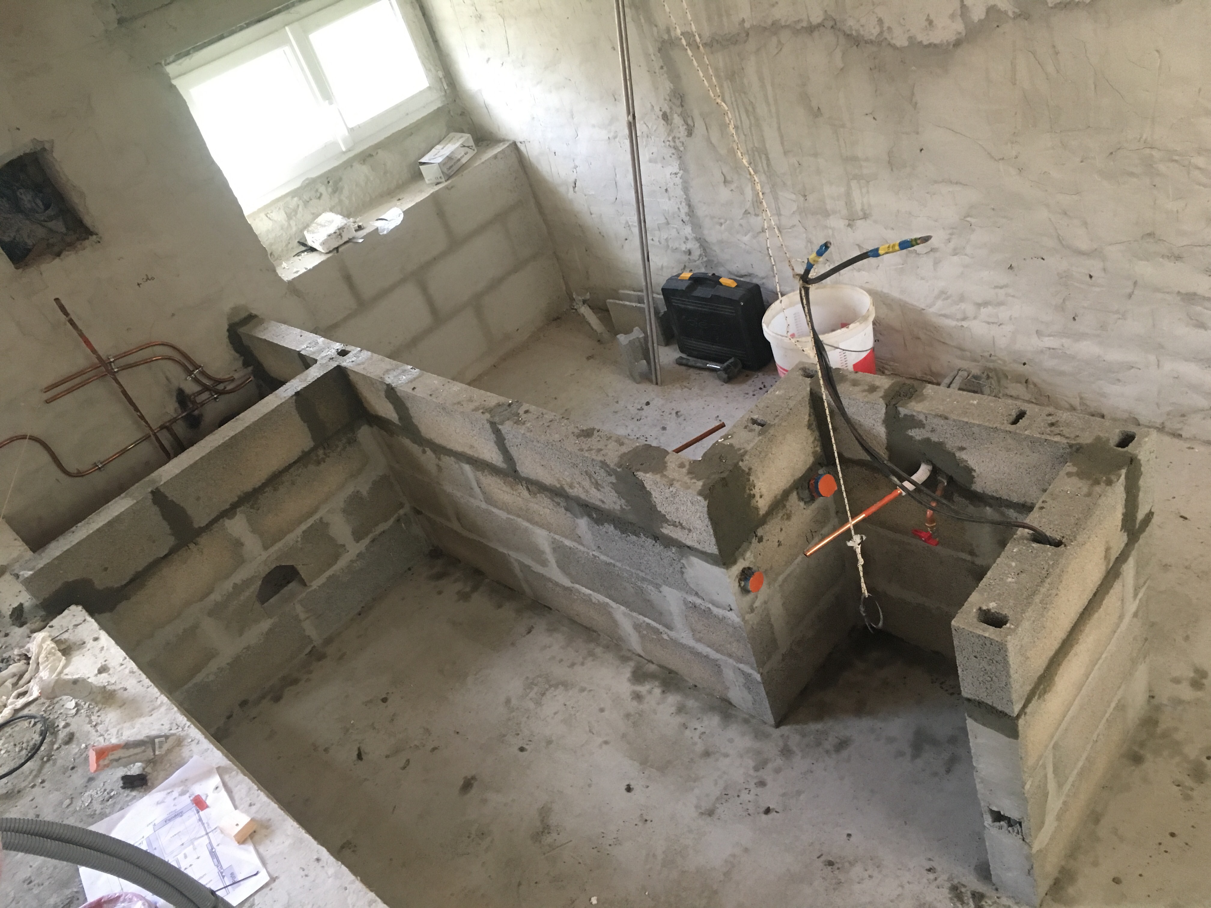 J’ai même eu assez de temps pour rajouter un rang au mur… Les tuyaux vers les vasques des WC et de la douche sont en place… impec!