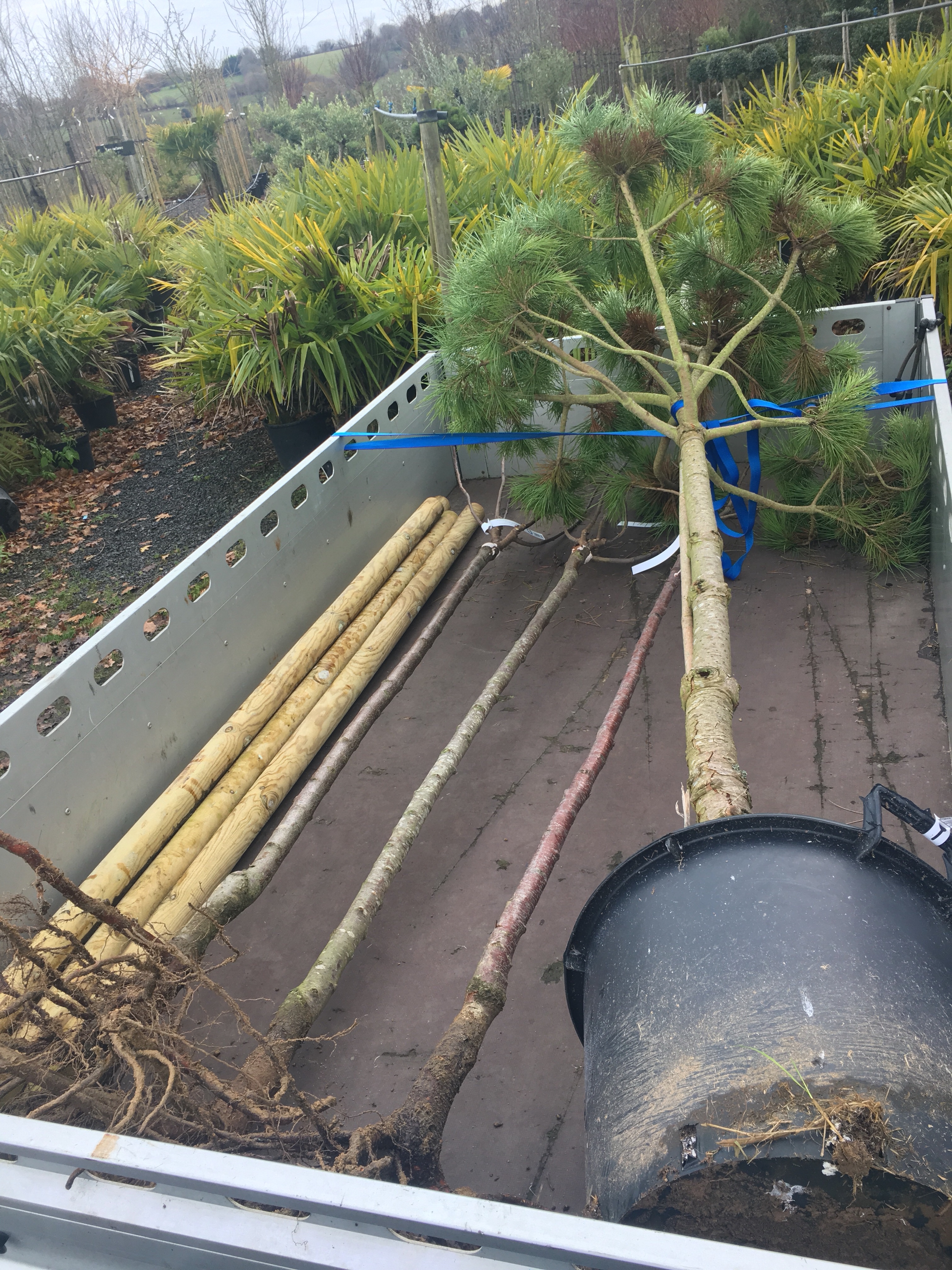 Arrivés à la pépinière, on apprend que les peupliers n’ont pas été livrés, on se rabat sur d’autre arbres (on comptait malgré tout prendre des fruitiers): deux pruniers, un cerisier, un pin parasol et un lilas)