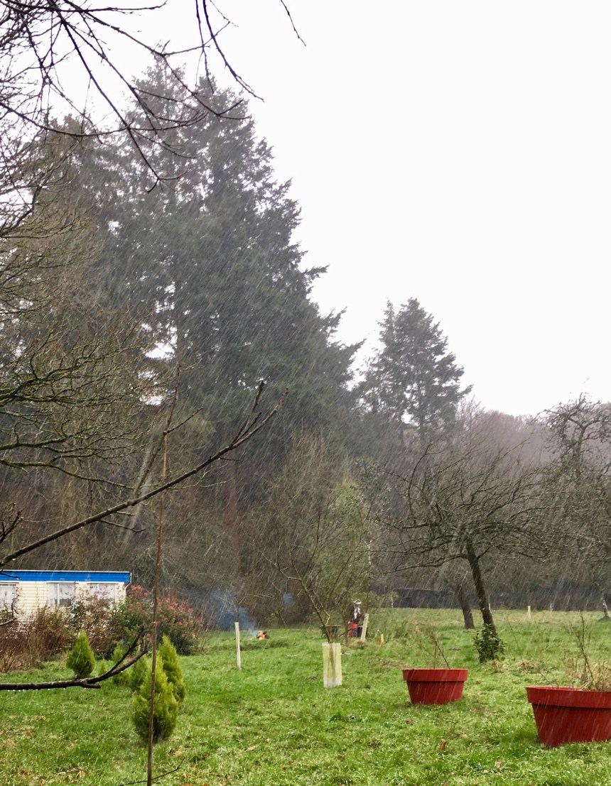 De retour l’après midi pour nettoyer le terrain de toute les grosses branches tombées suite à la tempête des derniers jours. Nous n’avons finalement pas vu le soleil, la température n’a pas grimpé, et la pluie nous a conseillé de repartir plus tôt que prévu.