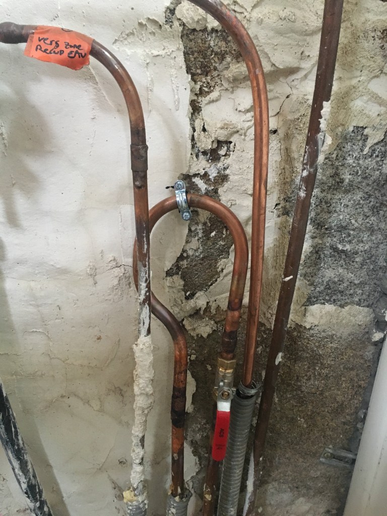 Objectif du jour, terminer la plomberie cuivre du Rez-de-Chaussée, et mettre en place un système de contrôle des fuites sur les soudures. Pour cela, j’ai acheté une bombone que je remplis d’air comprimé, et grâce à une pièce magique, je mets en pression (d’air) les tuyauteries afin de voir les fuites avant la première mise en eau (très pénible de devoir purger l’eau des tuyaux pour reprendre une soudure)