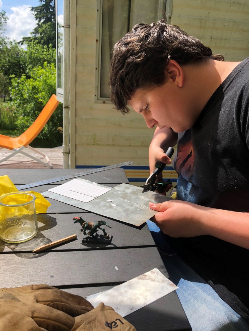 Le reste de la petite famille semble avoir moins souffert des bestioles taoniques… pour preuve Léo au travail sur la découpe de ses supports de figurines.