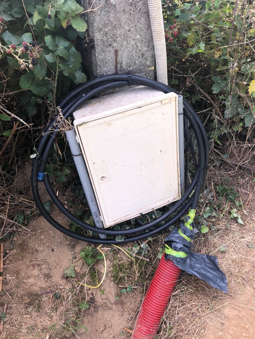 Depuis 6 ans pour ramener l’électricité dans la maison, nous utilisons une rallonge électrique rampant sur le terrain entre le compteur EDF et la maison (qu’il faut déplacer à chaque tonte!)… voilà que les choses ont changé aujourd’hui: un câble passant dans une gaine souterraine nous connecte maintenant au réseau électrique.