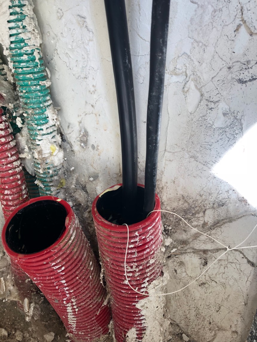 L’aiguille de la gaine ayant probablement mal vieilli, nous avons repassé une cordelette dans les 60m de la gaine. Ce fût ensuite le tour des deux câbles électriques de devoir traverser la gaine: un câble de 2x6mm2 (roule de 20kg) et un câble 3x35mm2 (roule d’au moins 60kg).