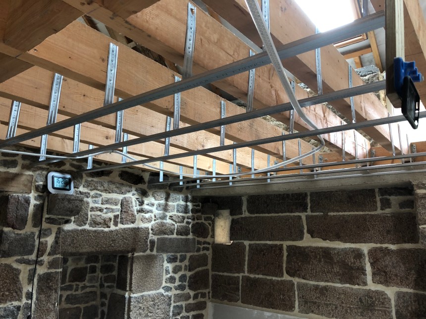 Week-end de 4 jours, et 2 jours passés à Le Gast, avec une première journée consacrée à tracer les positions des suspentes sur les solives du plancher. Elles supporteront les rails métalliques sur lesquelles seront vissées les plaques de placo du plafond.