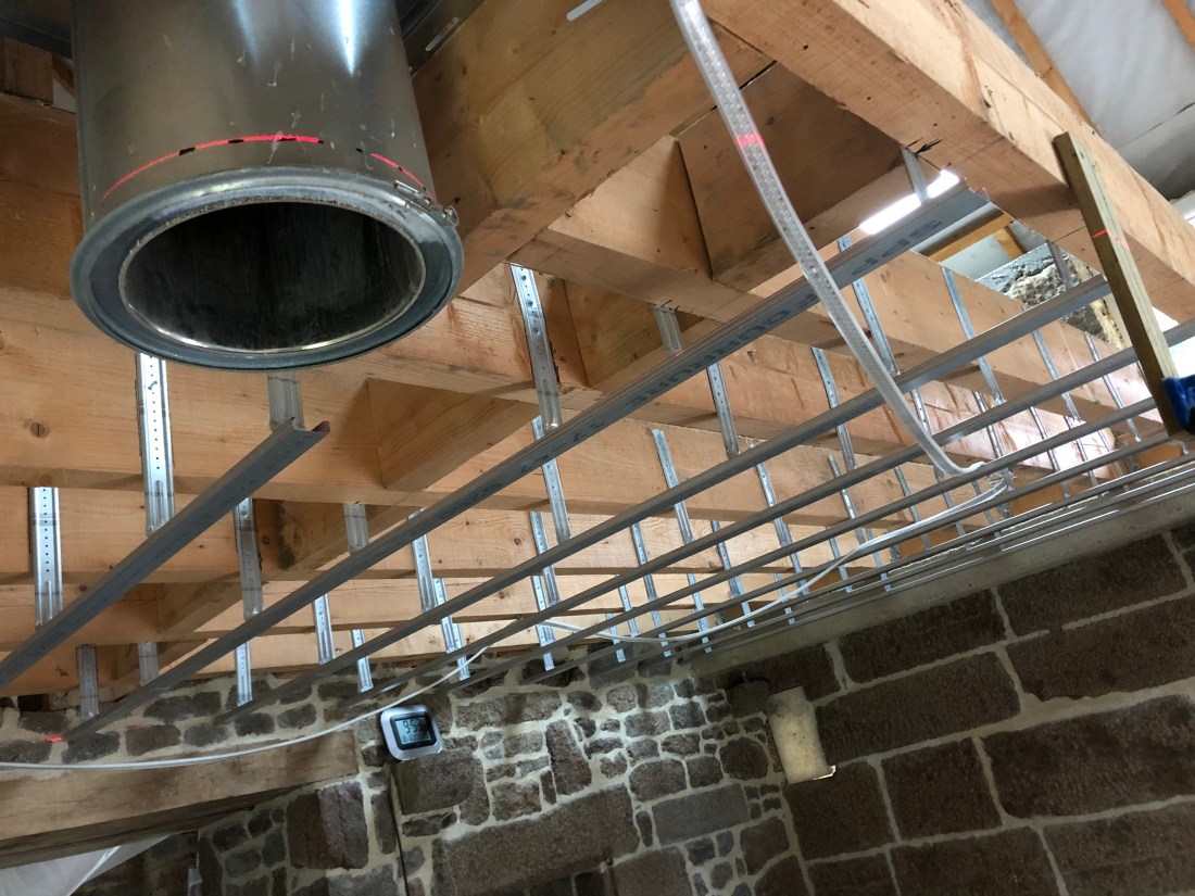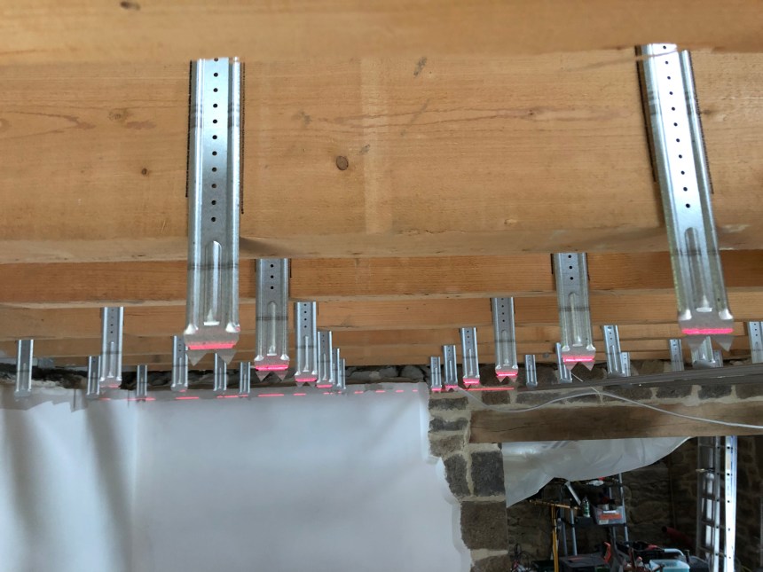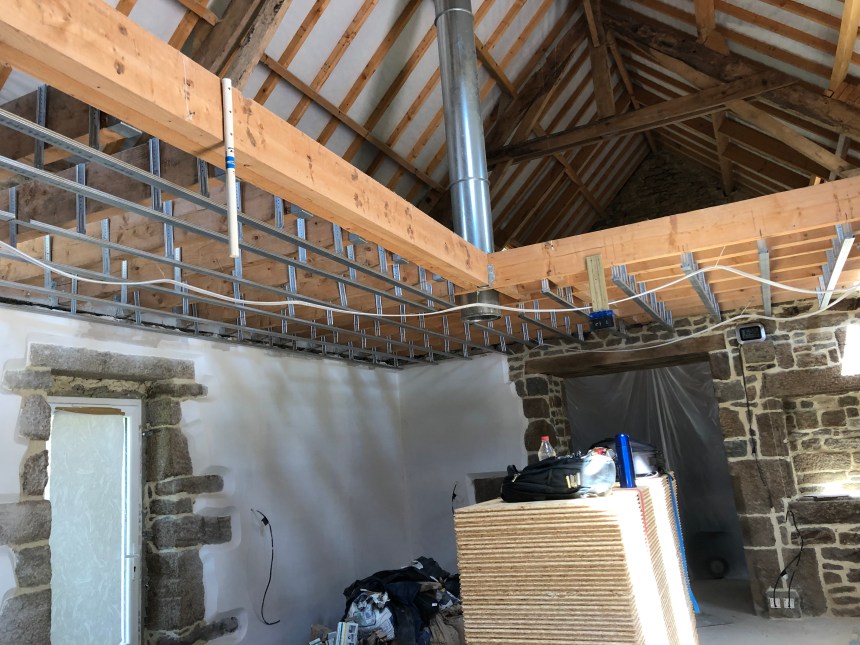 Un week-end solo en Normandie pour tenter d’échapper à la canicule nationale, et donc une grosse journée de travail à Le Gast pour avancer sur la pose des suspentes et ferrures pour le futur plafond du salon.