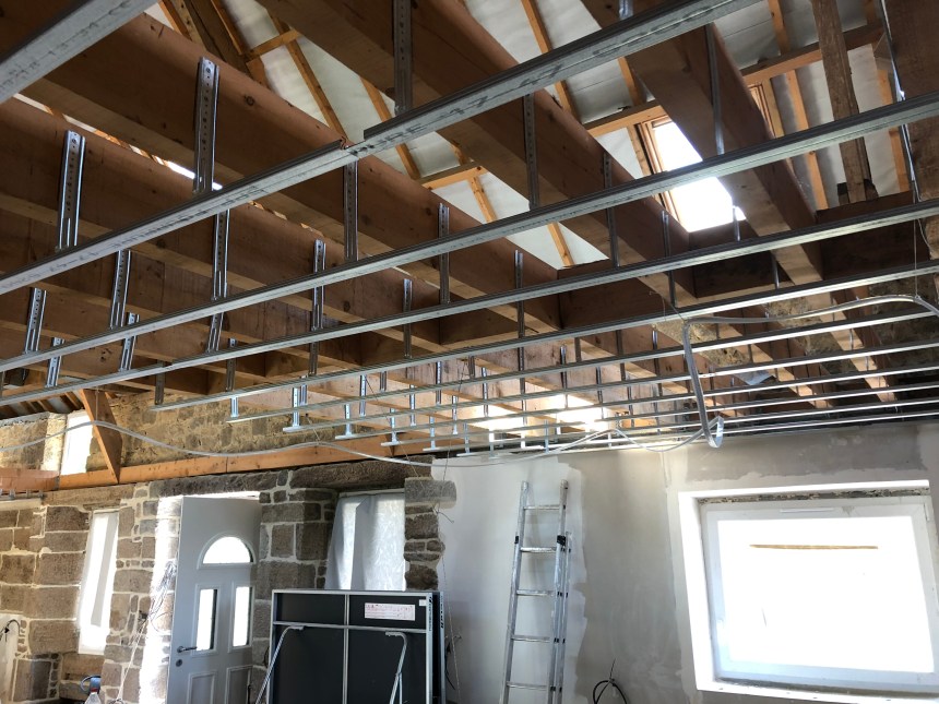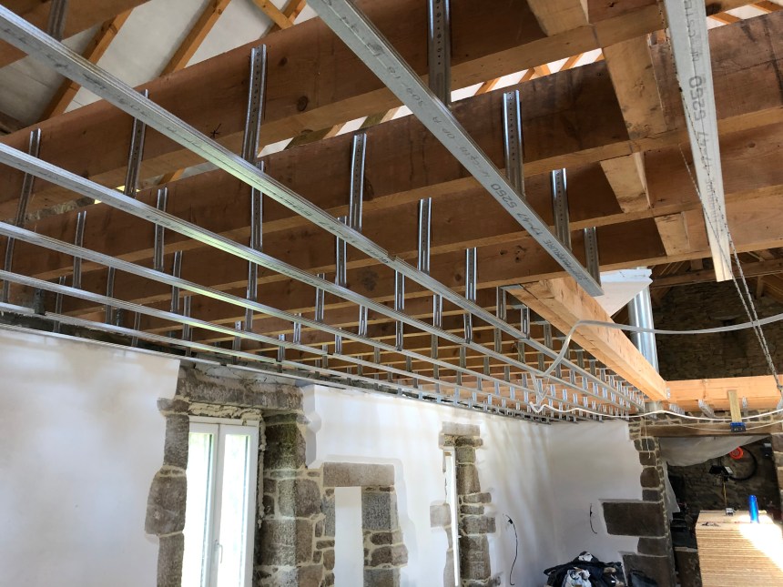 À l’intérieur de la maison, il fait relativement frais, rendant le travail un peu plus agréable. Après 7h de travail, toutes les ferrures sont posées (42m2 de plafond), les 300 suspentes bien fixées avec le millier de vis que j’ai utilisées aujourd’hui.