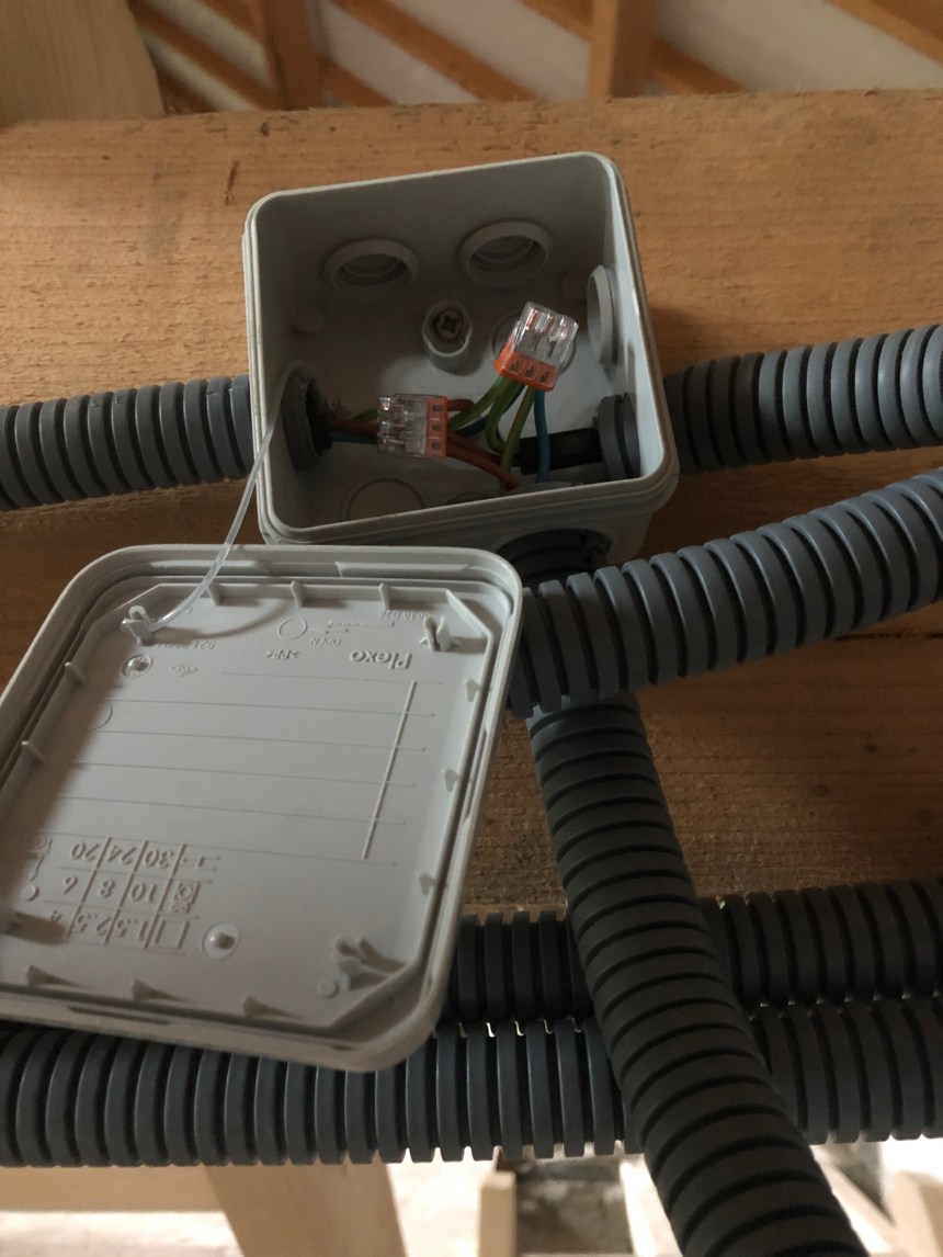 Ces derniers jours m’ont permis de câbler tous les points d’éclairages au plafond, dont 20 spots encastrés…. les premières boites de dérivation ont fait leur apparition pour permettre la distribution électrique sur chacun des groupes d’éclairage.