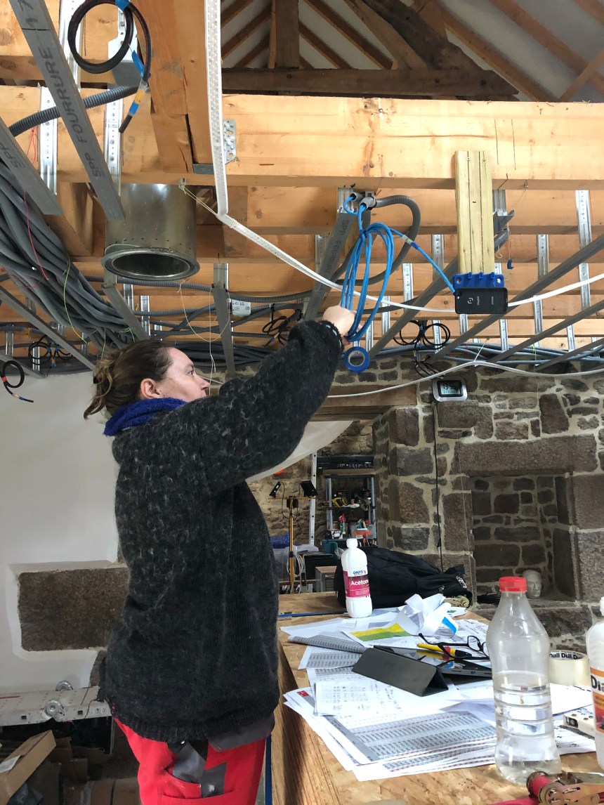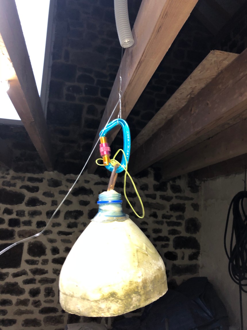 Ces derniers jours pluvieux ne m’ont pas permis de dérouler la gaine dehors, il a donc fallu ruser pour pouvoir gérer le passage des câbles dans les gaines les plus longues… un poids en béton me permettait de tirer sur l’aiguille de la gaine et ainsi aider au passage du câble pendant que je le poussais à l’autre bout de la gaine