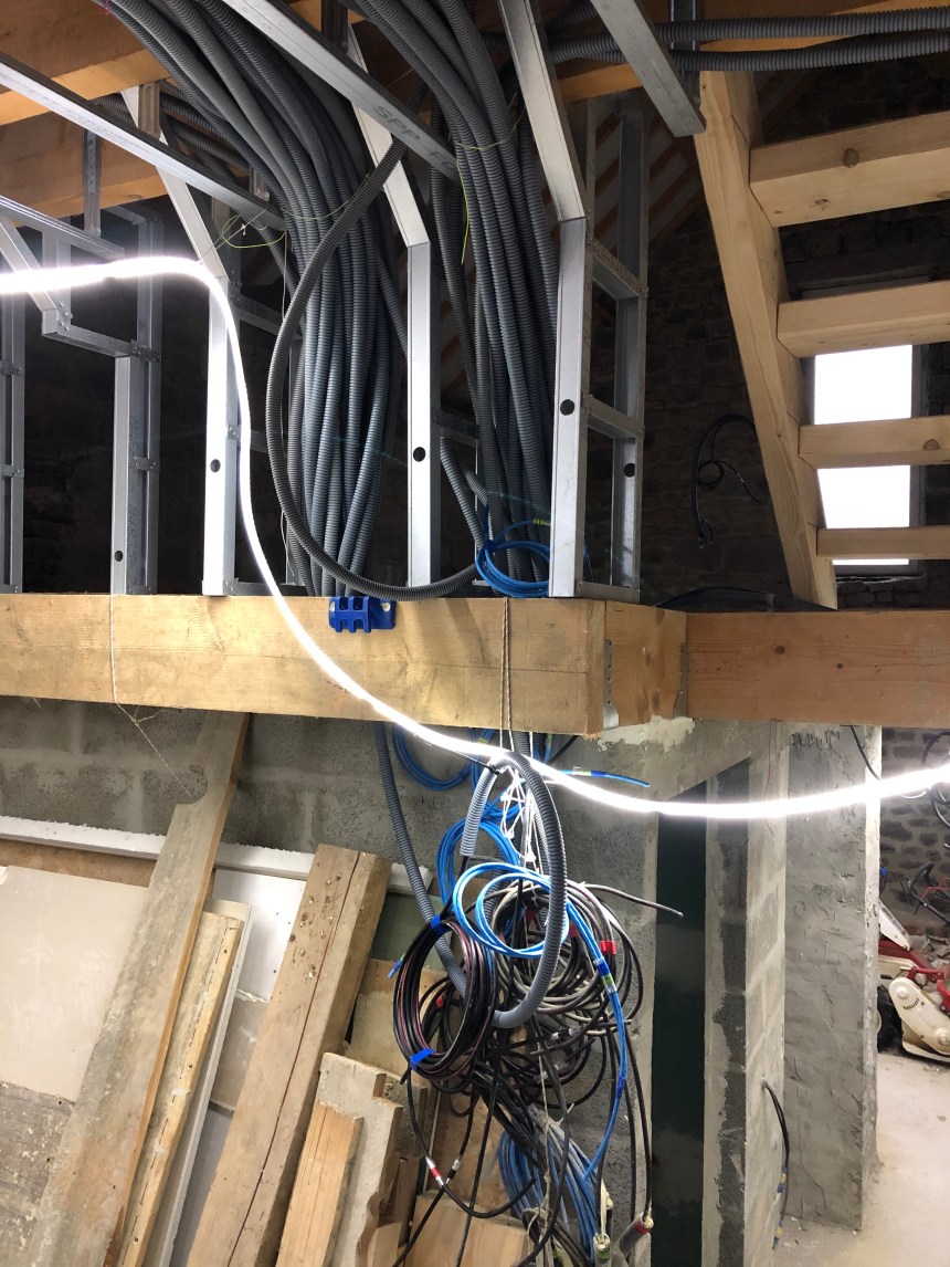 Au final, pas mal de câbles pendouillent au plafond en attente d’être branchés aux futurs spots encastrés, les autres sont enroulés sur les solives du 1er en attendant d’être cachés dans les murs des futures pièces.