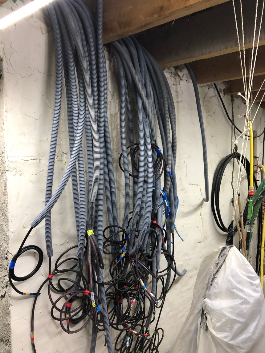 Tout comme lorsqu’il s’agissait de poser les câbles à immerger dans la dalle de béton, la plus part des derniers arrivent au point central où sera placé le tableau électrique… là encore, la zone est maintenant bien remplie!