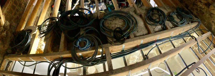 Il ne reste vraiment plus beaucoup de câbles à passer dans le plancher avant de pouvoir commencer à envisager de poser le plafond puis le plancher du 1er.
