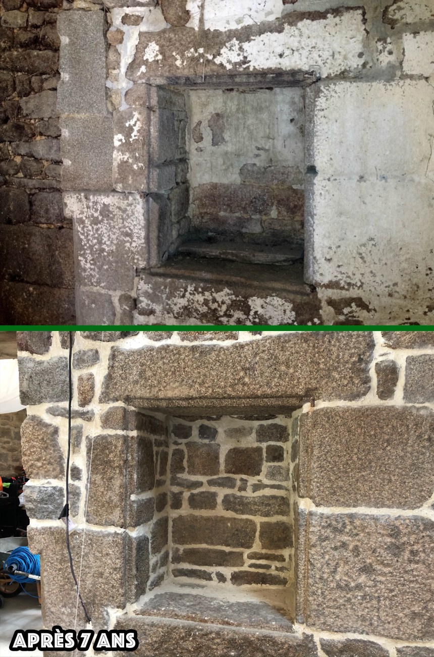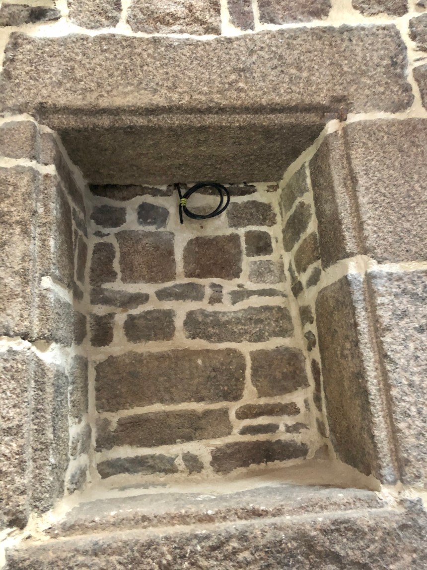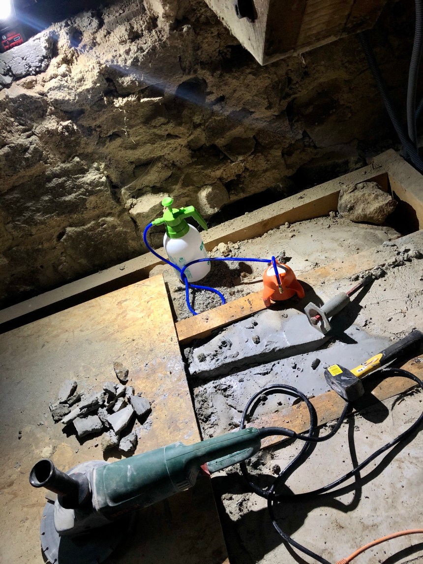 Au programme le passage de certains câbles qui nécessitent de tronçonner quelques pierres sur le haut de murs intérieurs. J’ai pu tester mon système autonome (c’est à dire sans besoin de l’aide de Tom ou Léo!!) d’arrosage du disque de tronçonnage… ça marche super (le petit support orange au bout du tuyau bleu!!)