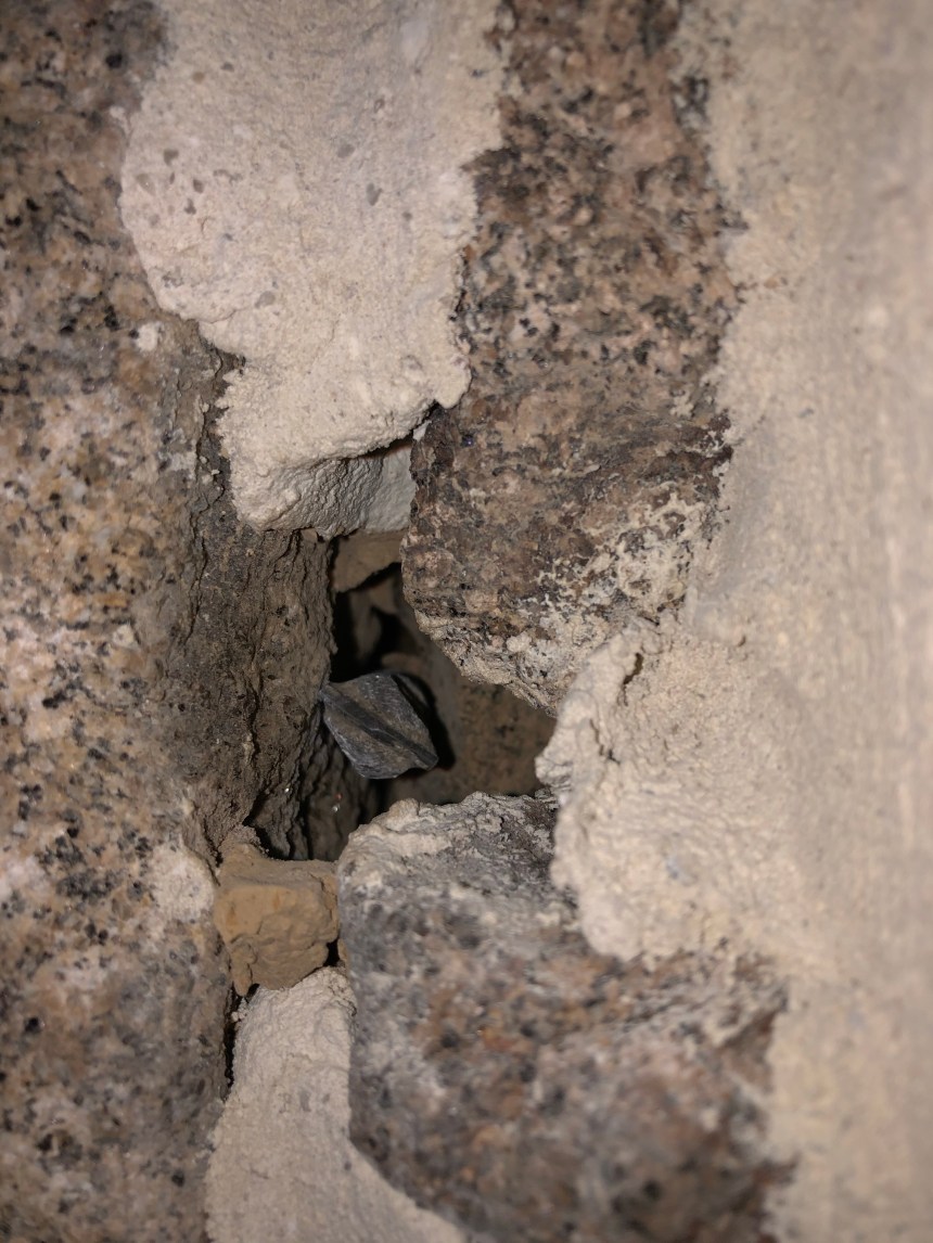 Autre petit sujet qui changeait du passage des gaines électriques: faire un trou vertical d’un mètre de longueur pour éclairer l’alcove dans le mur du salon… petite satisfaction lorsque le forêt pointe exactement à l’endroit ciblé! (C’est la tête du forêt que l’on voit sue la photo suivante)