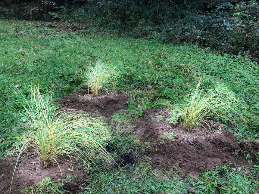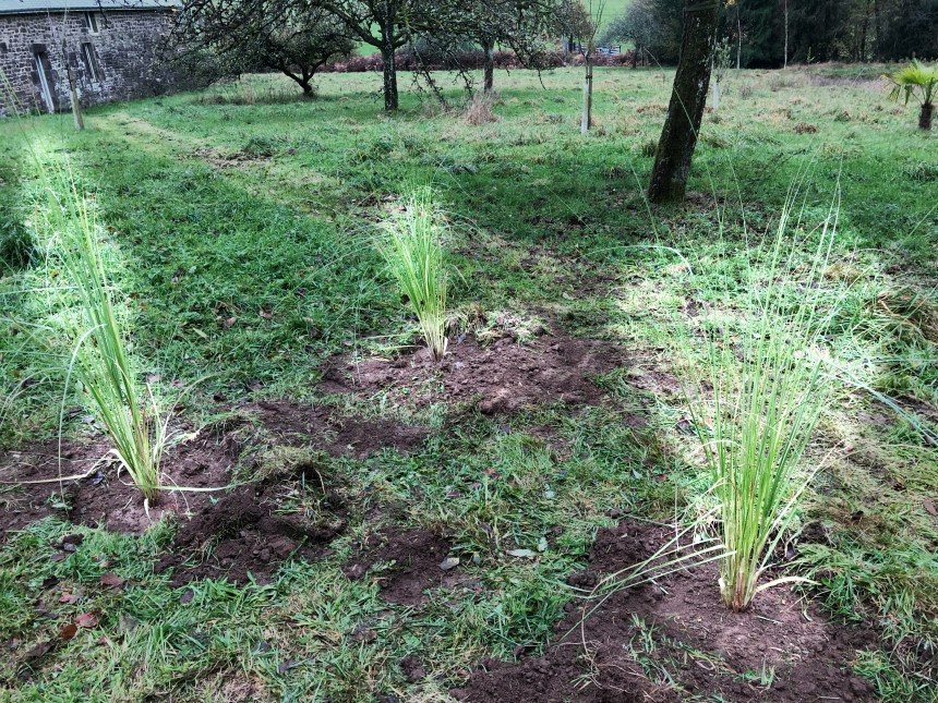 La plantation s’est faite par groupe de 3 plantes. Tout cela devrait pousser rapidement et prendre un peu de place sur le terrain: c’est autant de surface que l’on n’aura plus à tondre!