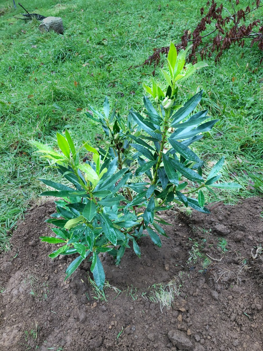 Et pour finir, la commande spéciale de Béatrice: un rododindron… Au final, et en faisant un comptage rapide, c’est plus 70 arbres et arbustes que nous avons planté sur le terrain depuis 7 ans!!