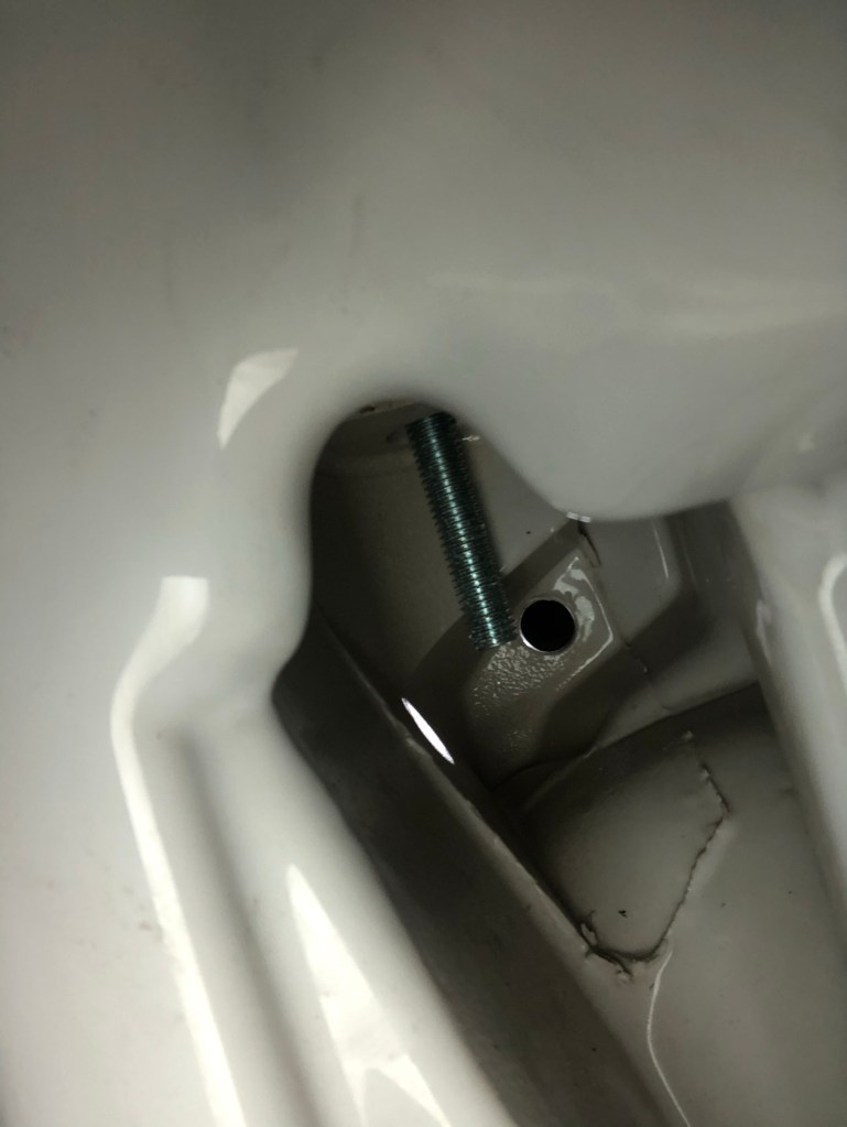 La fixation de la cuvette a été un exercice de contortion pour réussir à positionner les rondelles et les écrous par dessous la cuvette, au travers d’un espace pas vraiment généreux.