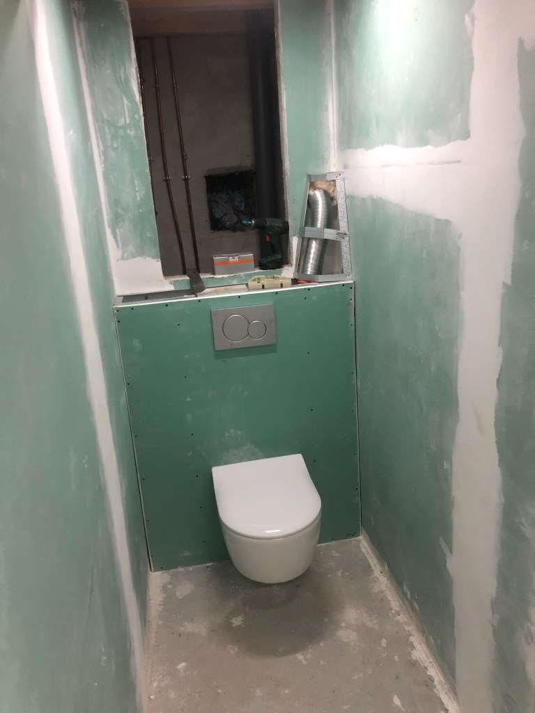 Ensuitre, découpe de la plaque de placo principale, avant de pouvoir fixer la cuvette.