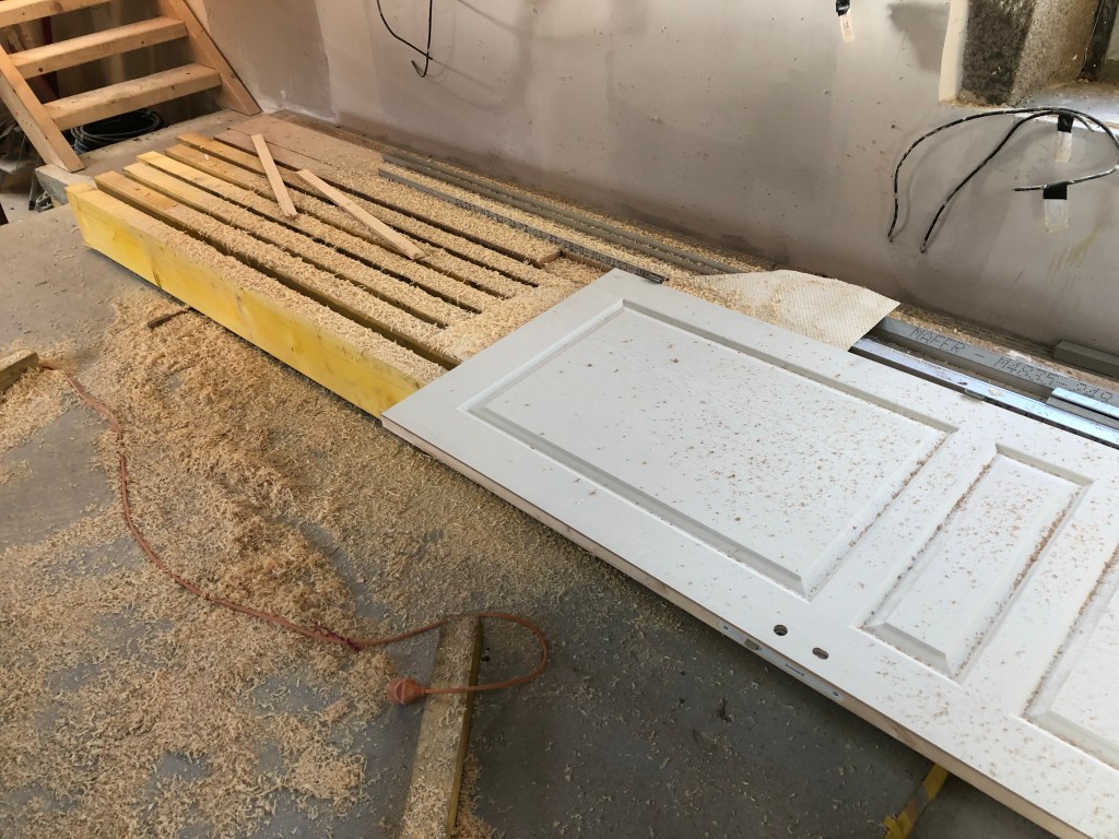 Il a ensuite fallu raboter le cadre de la porte pour ajuster la largeur à celle du logement dans le mur… ambiance sciure de bois!