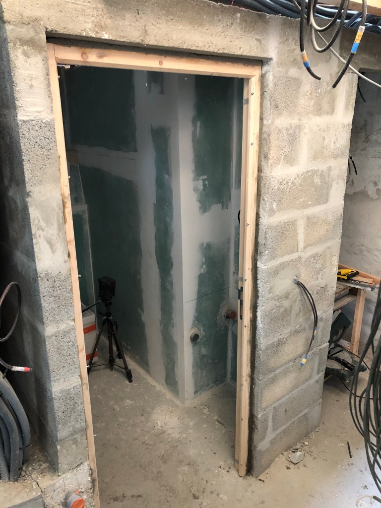 Quelques trous, des chevilles et des vis, un peu de ciment pour sceller le cadre de la porte… on y est presque!