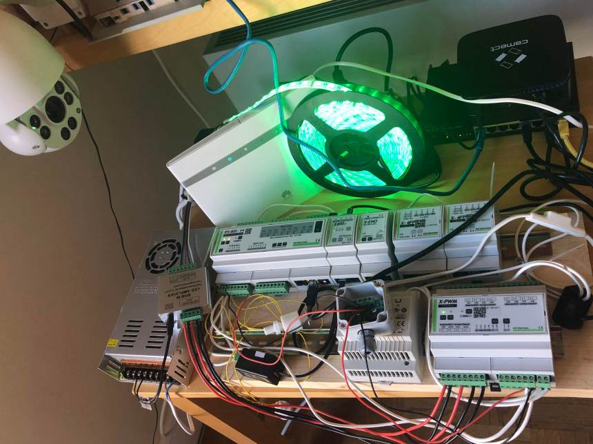 Le tout tient sur une petite table, mais les emplacements définitifs à Le Gast sont déjà prévus, ainsi que le câblage. Il restera un peu de configuration à prévoir pour que la centrale domotique puisse réagir correctement en fonction des informations qu’elle recevra.