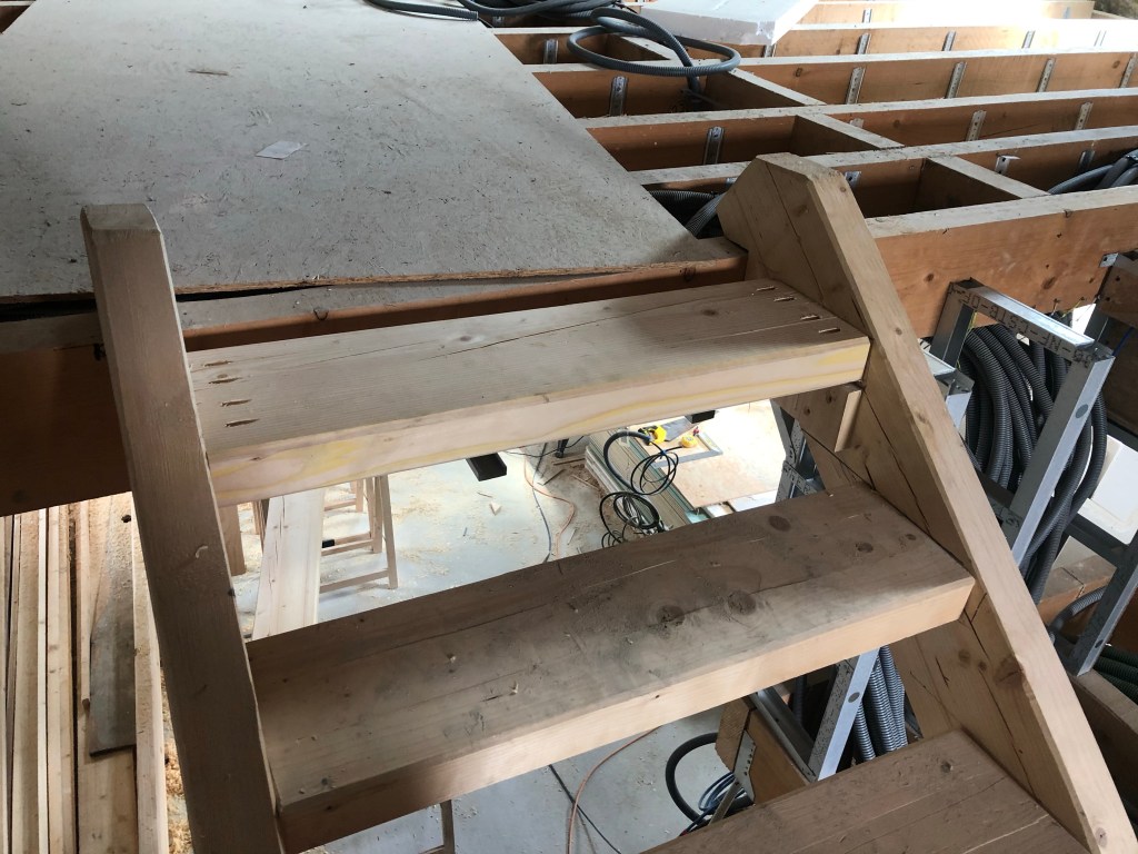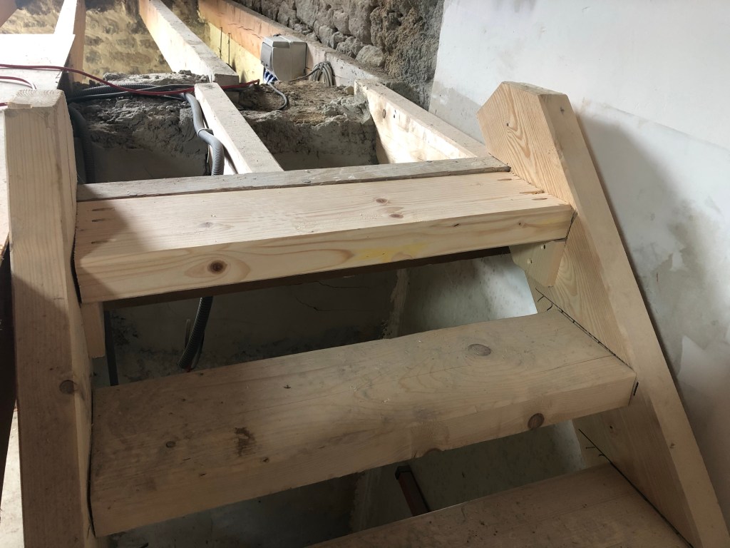La pluie interrompt le travail dehors, et j’en profite pour rajouter les dernières marches qui manquaient sur les escaliers en bois à l’intérieur.