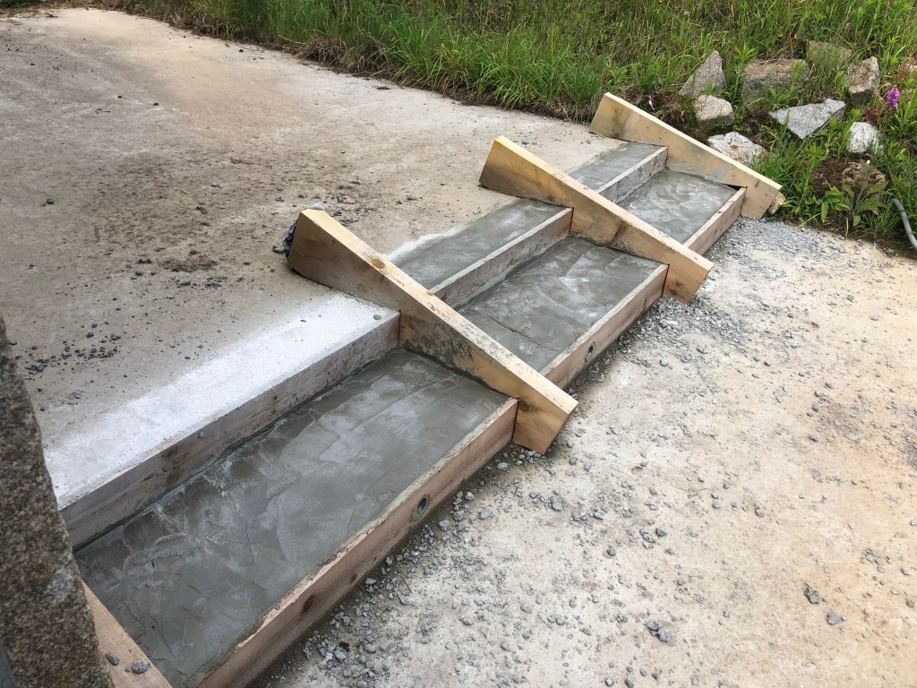 Les marches en béton ont bien séché, on tente de retirer les coffrages en bois, mais ce n’est pas si simple, les montants en bois sont bien immobilisés dans le béton. Je vais devoir raboter certains des marches pour retirer le béton en trop et retrouver des surfaces plus horizontales.
