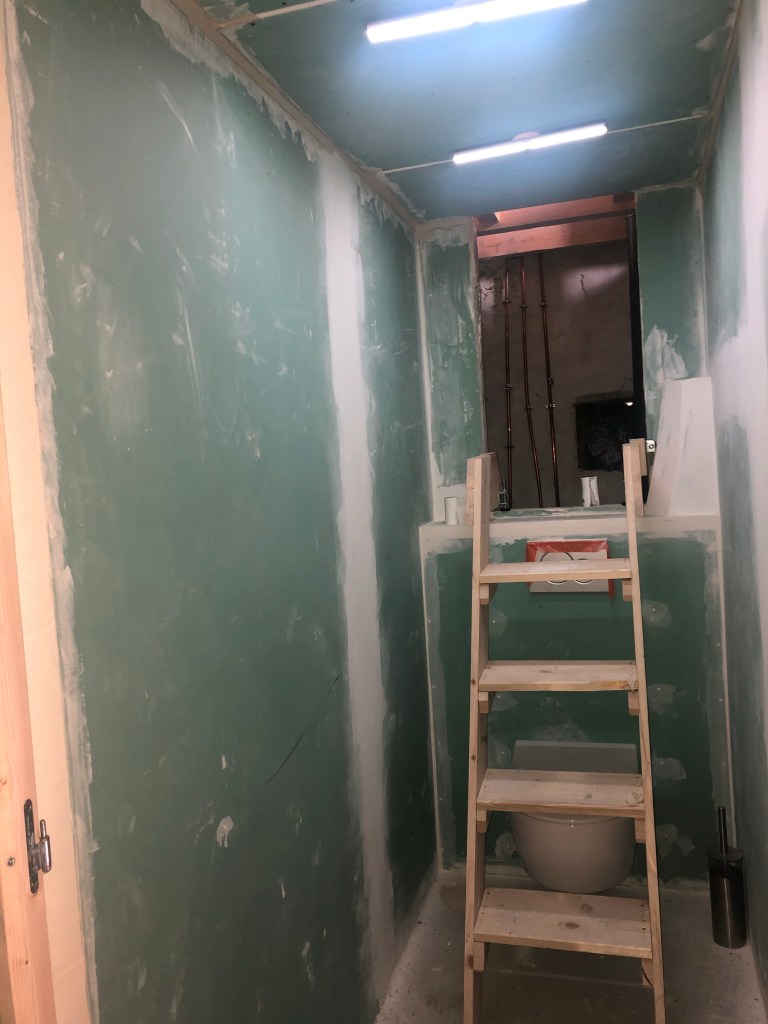 Le dernier jour sera quasiment consacré à la mise en place du plafond en placo des toilettes… ce sera le premier plafond de Le Gast!
