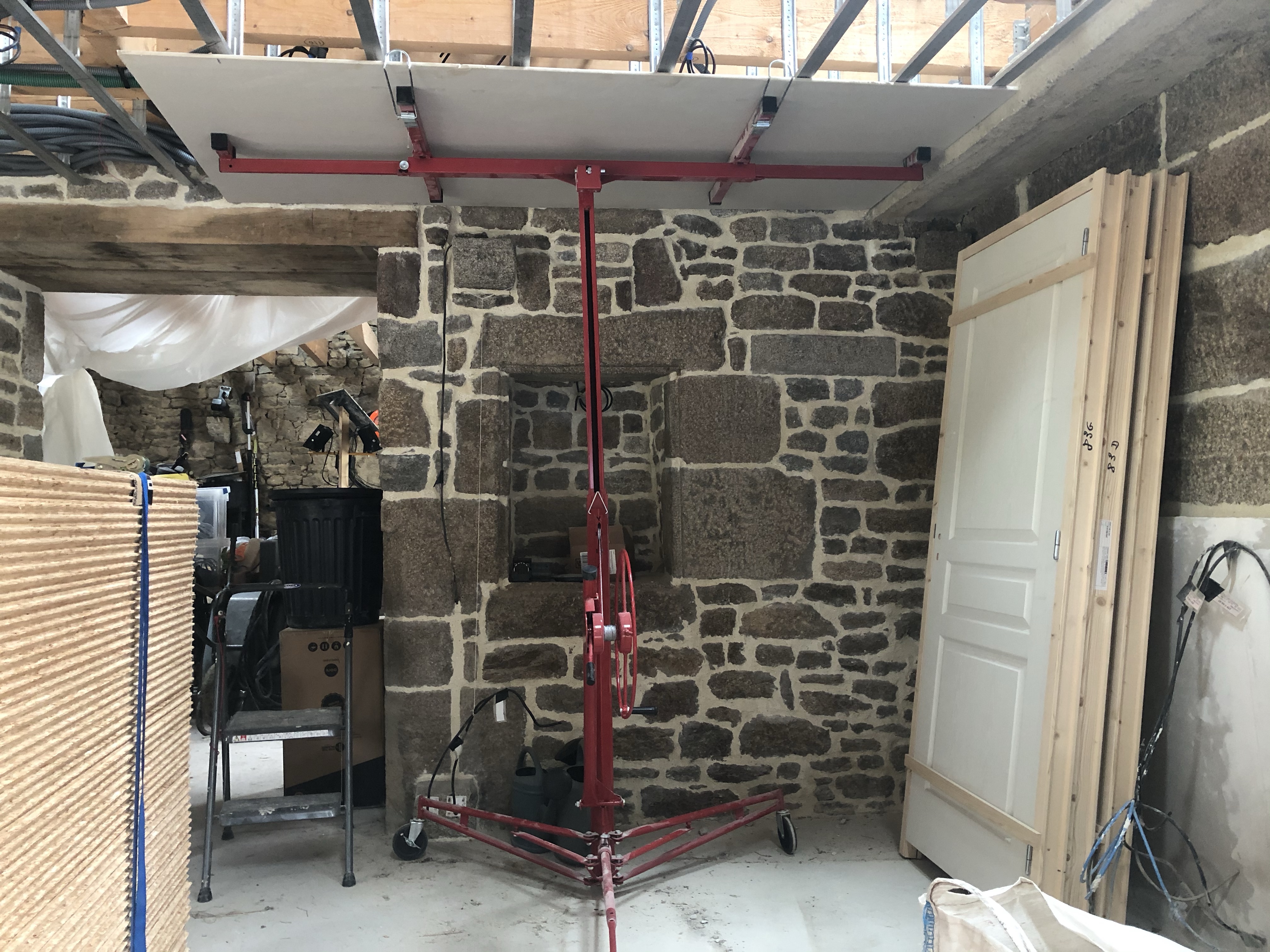 Les plaques de placo sont assez lourdes (une petite trentaine de kilos) et les manoeuvres avec le lève-plaque assez délicates pour se faufiler entre les obstacles tout en positionnant correctement chaque plaque.