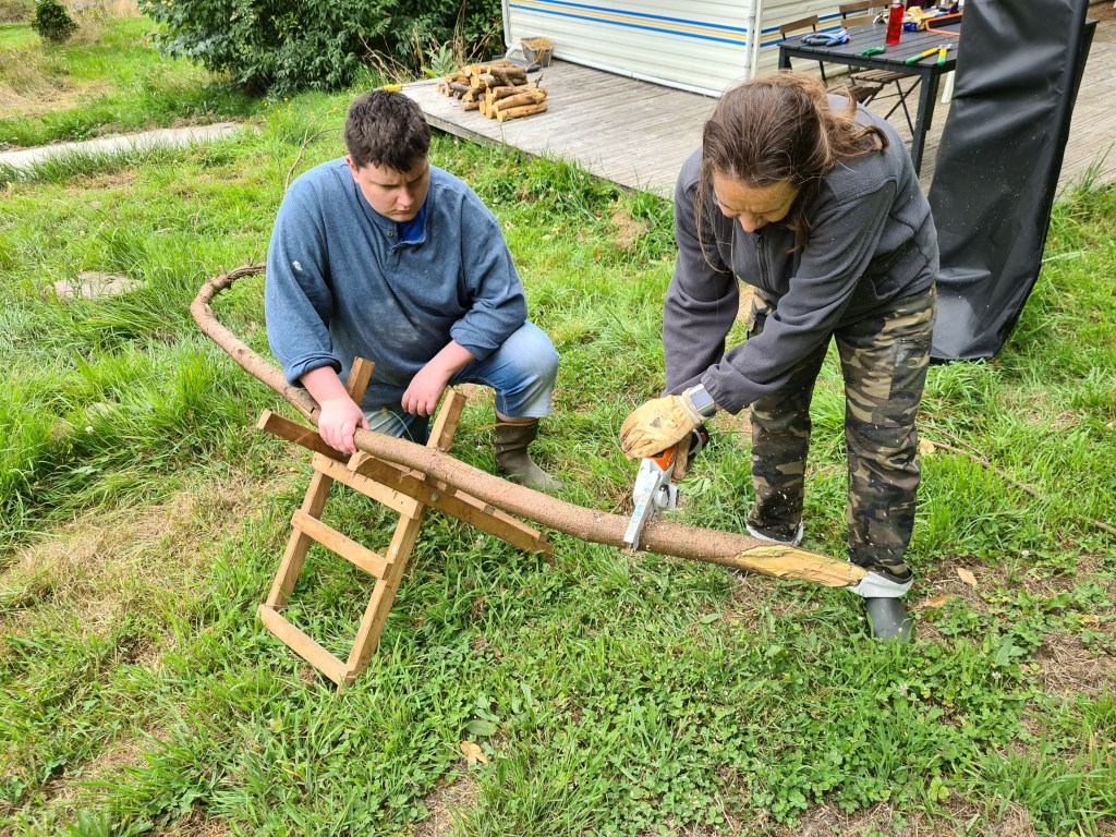 Béatrice prendra le temps de tester sa mini tronçonneuse pour débiter les branches tombées dans la forêt… adoptée!