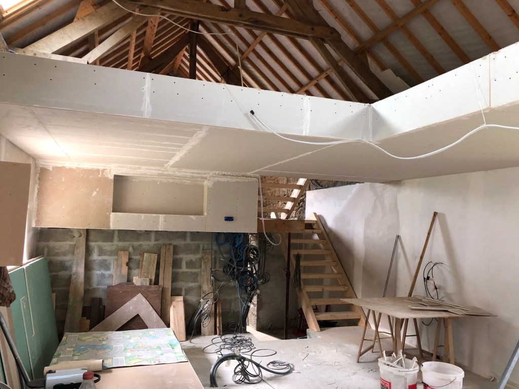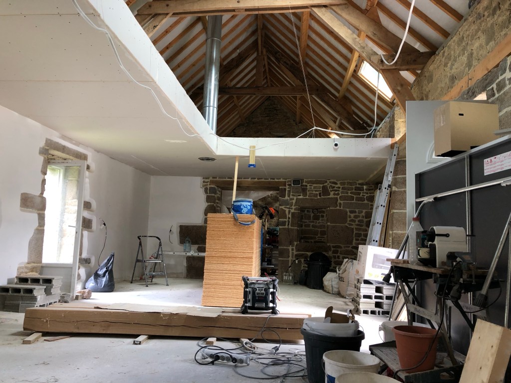 Petit week-end de 2 jours, mais 2 jours de travail à Le Gast pour essayer de poser toutes les plaques de placo restantes pour la pièce principale, et notamment à l’endroit de la cuisine et autour de la mezzanine.