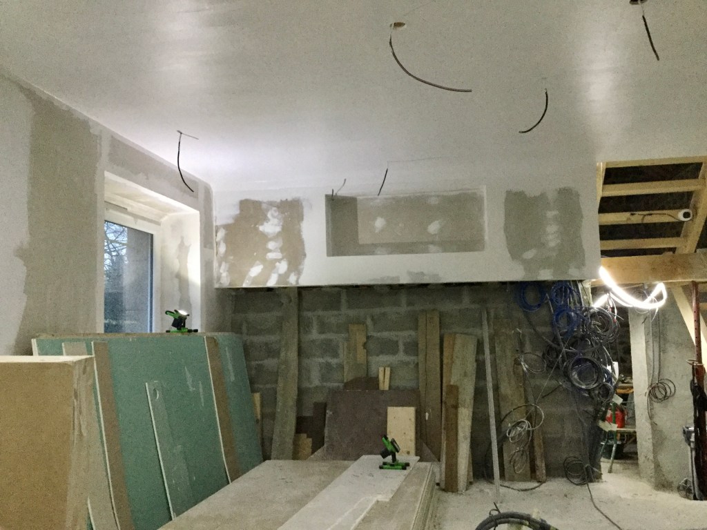 De mon coté, après quelques retouches d’enduit, je me lance dans la première couche de peinture sur le plafond.