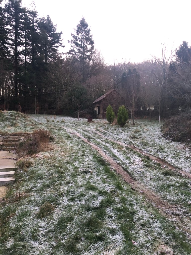 En arrivant, c’est toujours le givre qui blanchit le terrain… Il n’y a (malheureusement) plus de trace de la neige tombée la semaine dernière.