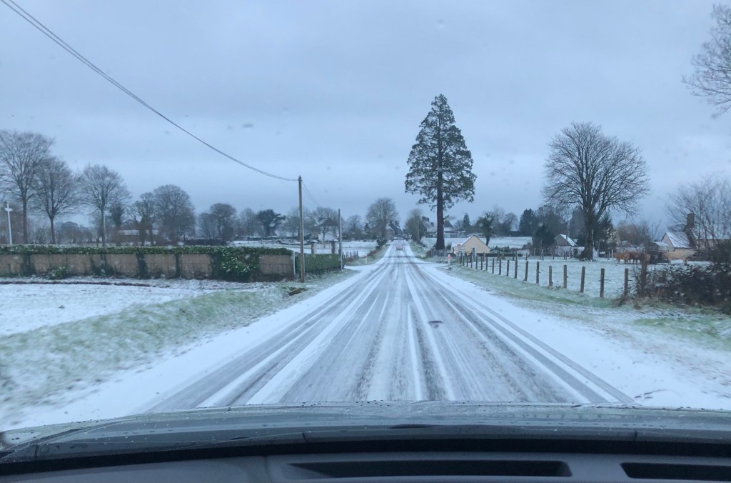 C’est sur les 15 derniers kilomètres que la neige a fait son apparition. Il n’en est pas tombé beaucoup, mais suffisamment pour tout blanchir et rendre les routes un peu glissantes… sympas de voir les paysages ainsi transformés!