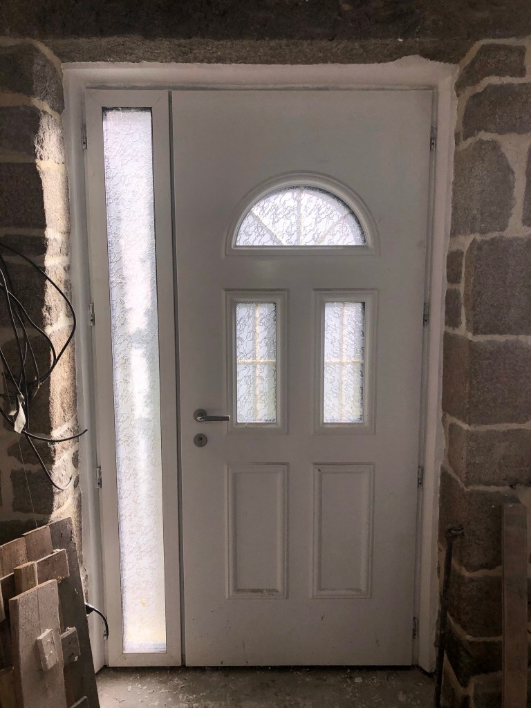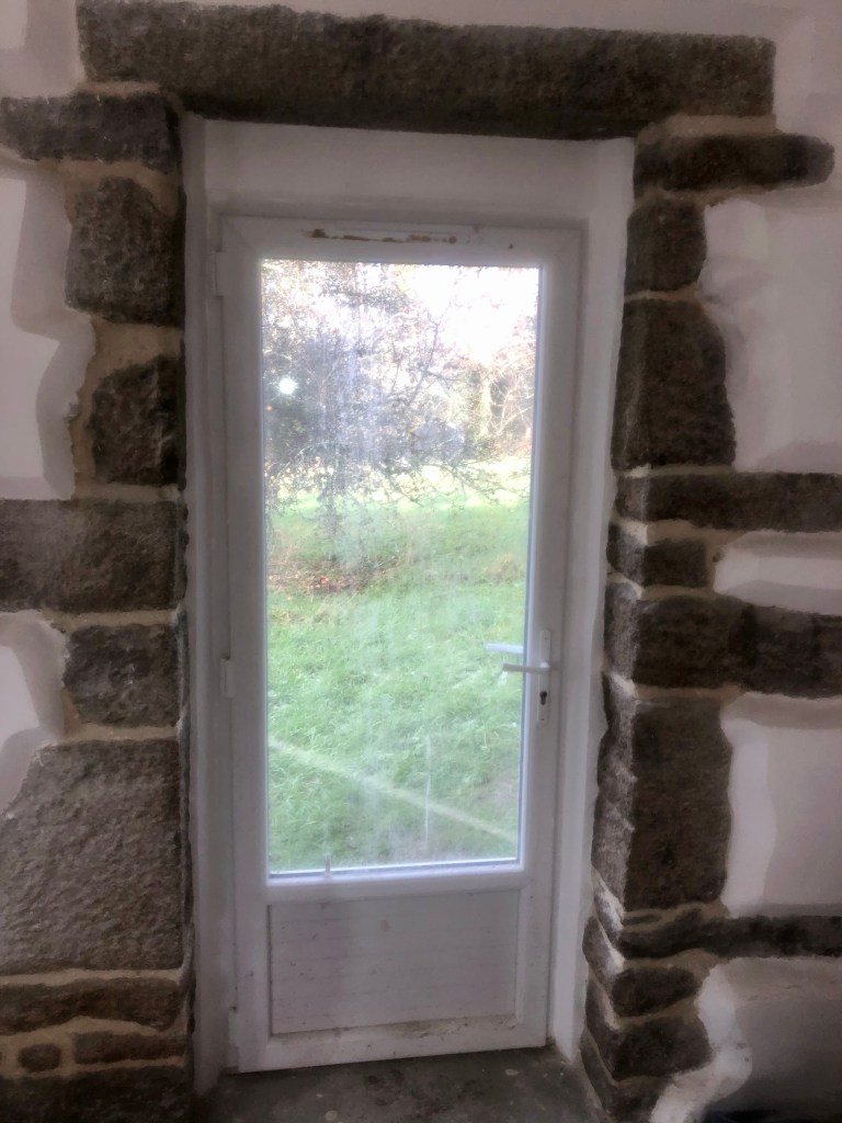 Je passe la première couche de peinture blanche sur tous les habillages de fenêtre… le rendu final est sympa, les pierres restent bien présentes sur les tours des ouvertures.
